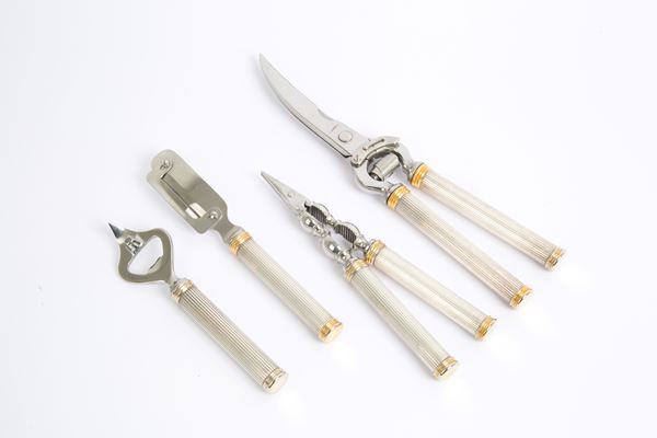 Set di quattro utensili da tavola in acciaio composto da un trinciapollo, un coltello da tartufo, pinze per crostacei e apribottiglie.