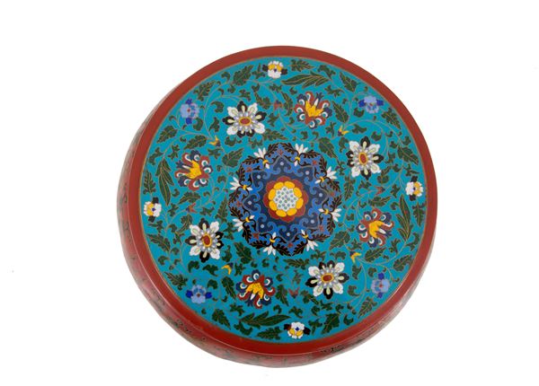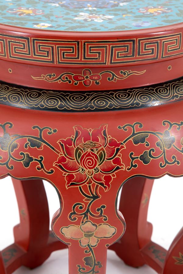 Sgabello in legno laccato a fondo rosso con decori floreali e seduta in metallo smaltato cloisonné. Cina.