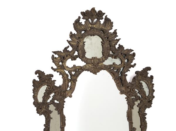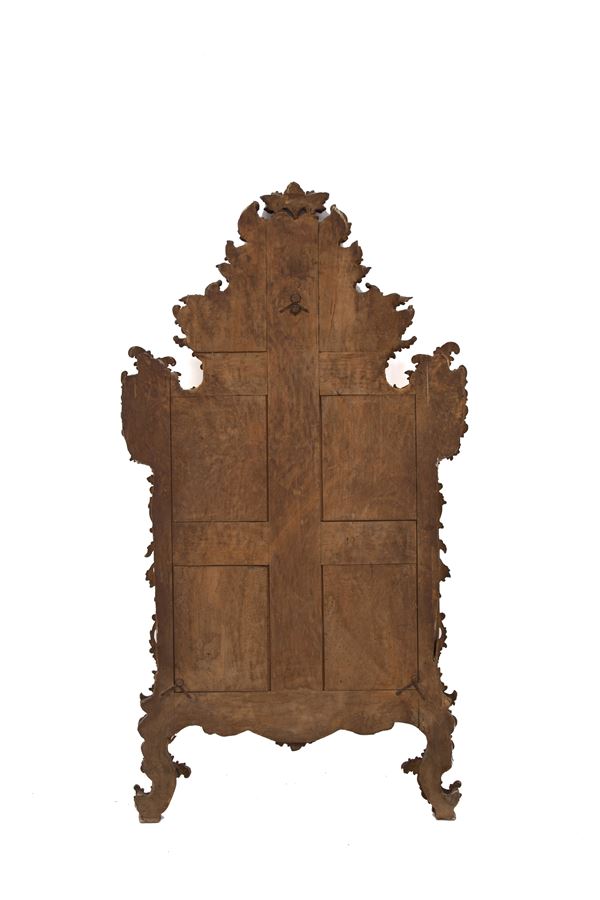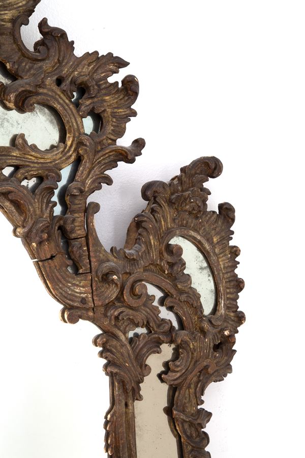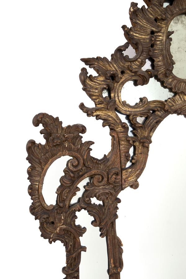 Specchiera in legno intagliato e dorato a mecca. Piemonte. XVIIl secolo. Difetti.