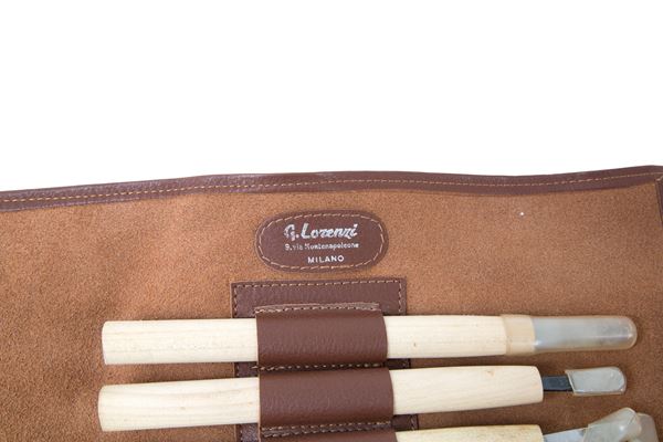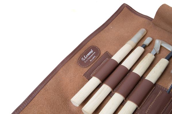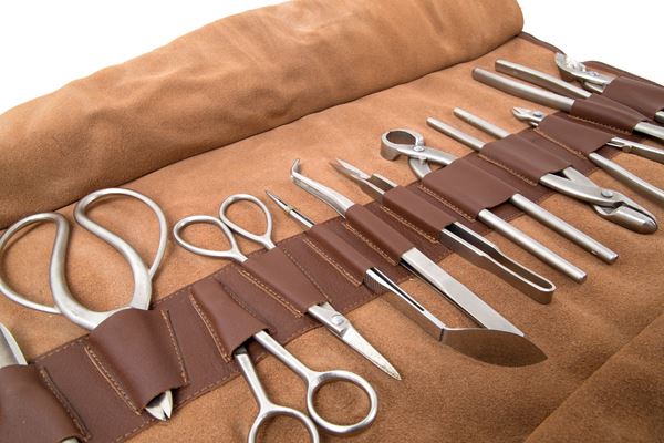 Strumenti e accessori per la cura dei bonsai in acciaio. Produzione MASAKUNI. Con custodia originale di G. Lorenzi, Milano.