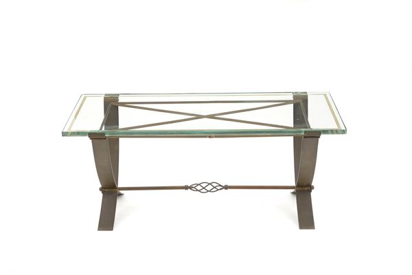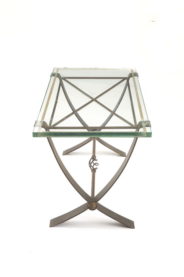 Tavolino in ottone con piano in vetro spesso. Anni '50. Difetti.