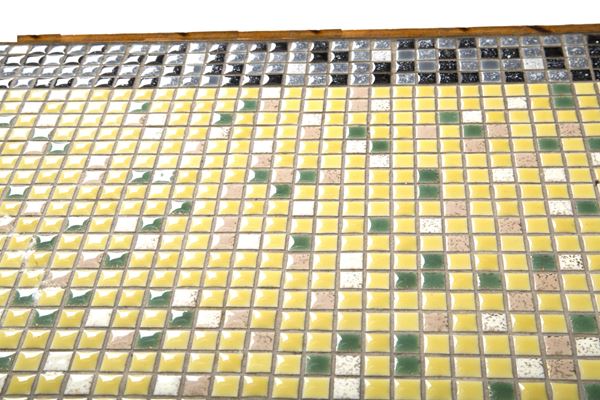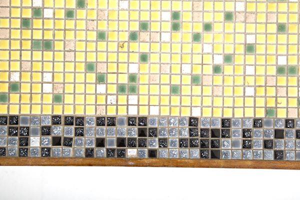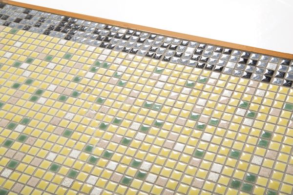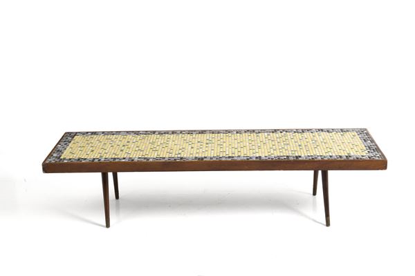 Tavolino in legno con piano a mosaico a motivi geometrici. Anni '60.
