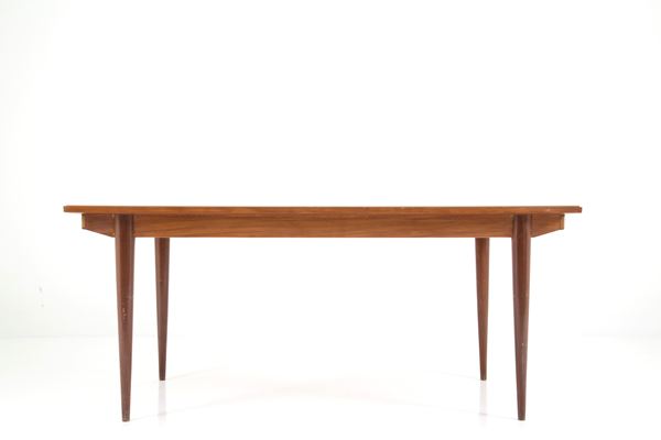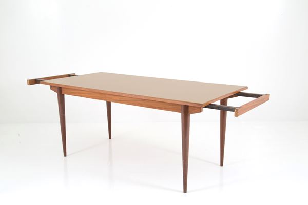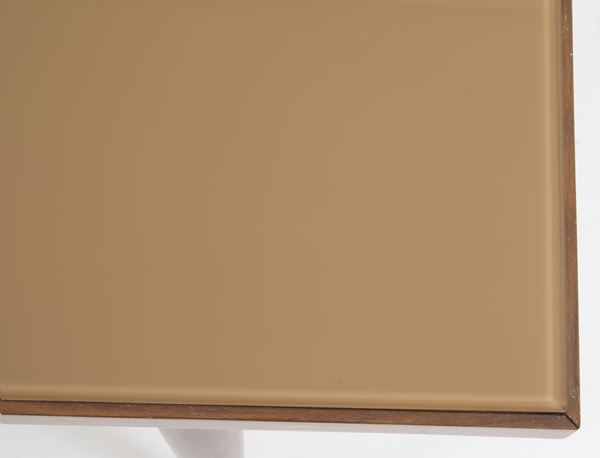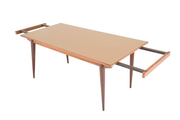 Tavolo con meccanismo allungabile impiallacciato in mogano con piano in vetro color nocciola. Anni '70. Mancante di allunghi. Segni di usure del tempo.