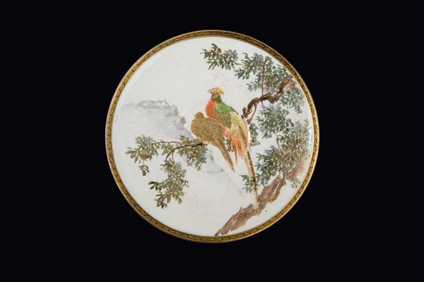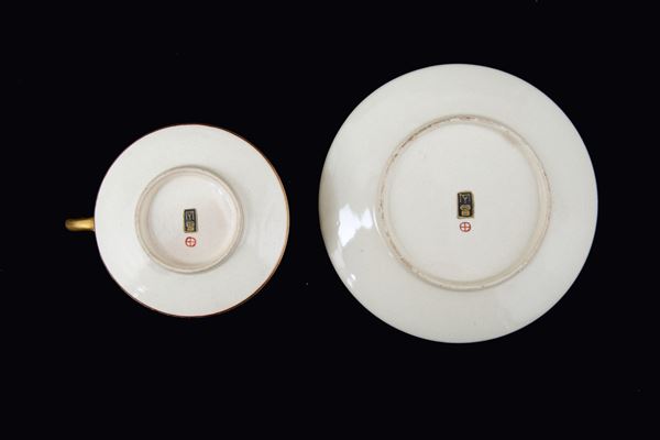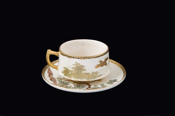 Tazza con piattino in porcellana Satsuma dipinta e decorata in oro zecchino. Entrambi marcati sul fondo. Giappone. Fine XIX secolo.