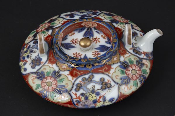 Teiera in porcellana Imari dipinta a motivi floreali e decorata in oro zecchino. Giappone. Fine XIX secolo. Mancante di manico.