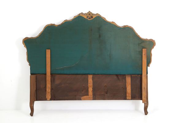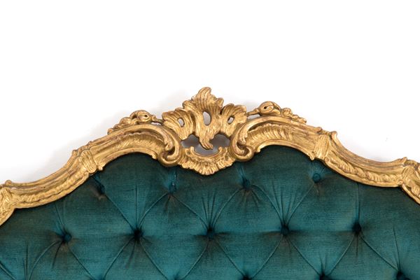 Testiera da letto in legno finemente intagliato e dorato imbottita a capitonné. XX secolo.