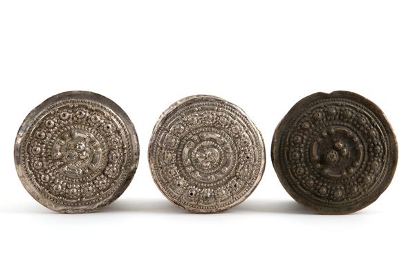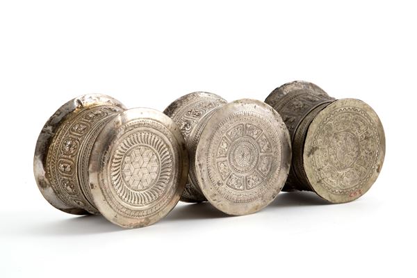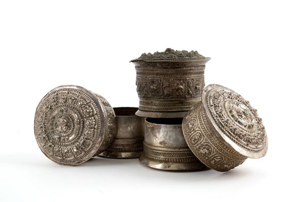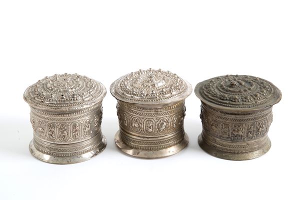 Tre scatole porta noci di Betel in metallo argentato finemente sbalzato e cesellato. Birmania. XIX secolo.