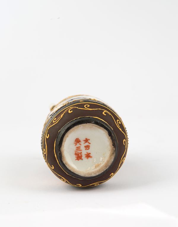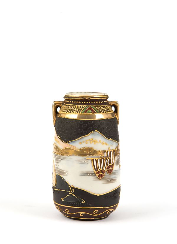 Vasetto con manici in porcellana Satsuma dipinta su fondo nero con decorazioni in oro zecchino. Marcato sotto la base. Giappone. Seconda metà del XIX secolo.
