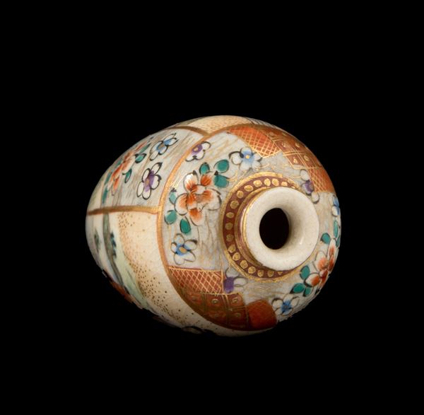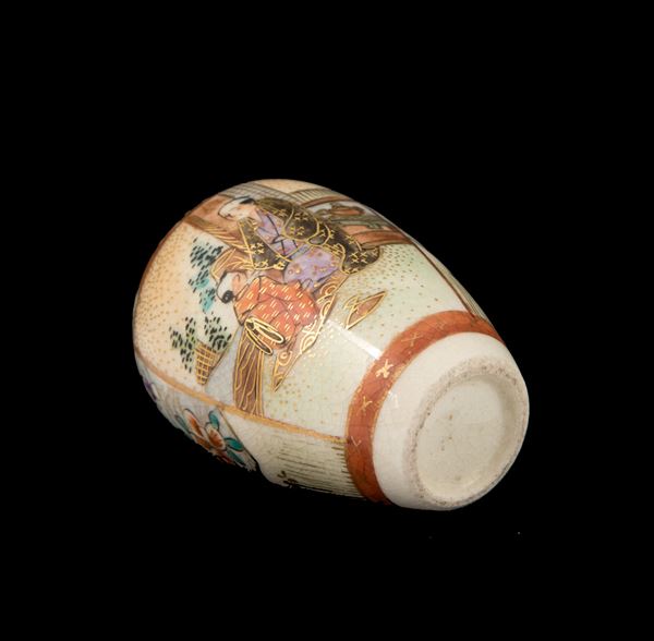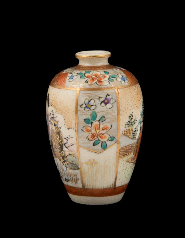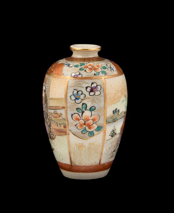 Vasetto in porcellana Satsuma dipinta con scene di genere su fondo oro. Giappone. Fine XIX secolo.