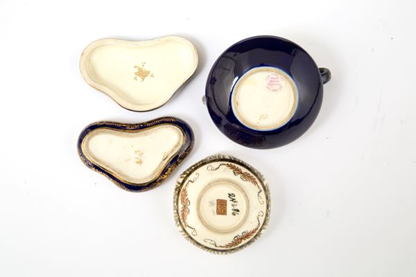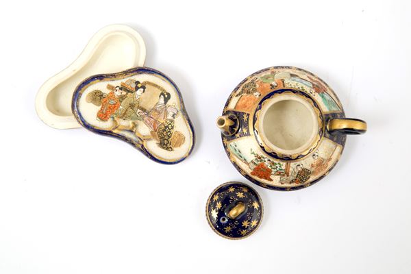 Vasetto, teiera, ciotolina e scatolina in porcellana Satsuma dipinta e con decorazioni in oro zecchino. Giappone. Fine XIX secolo.