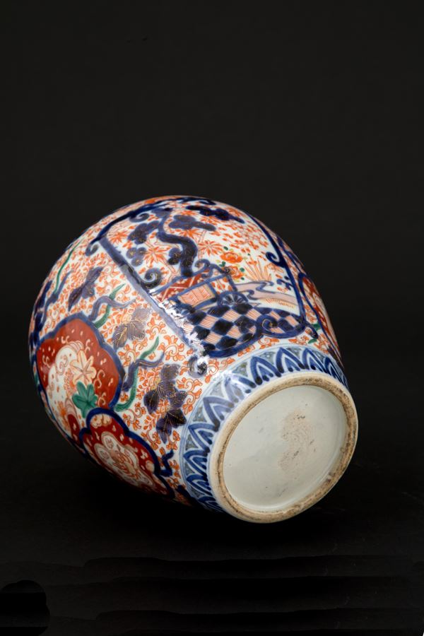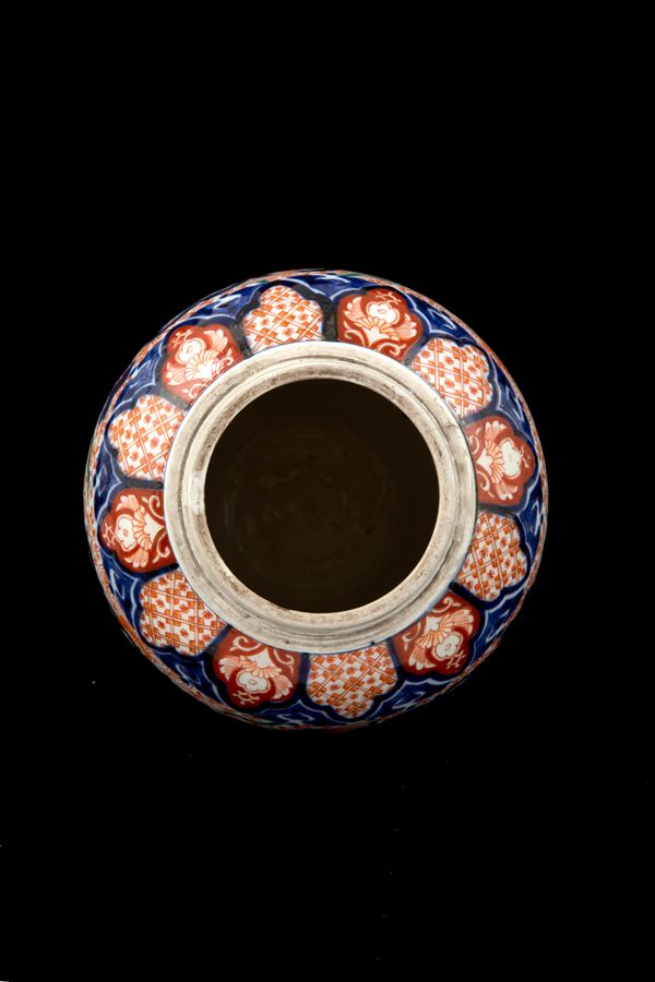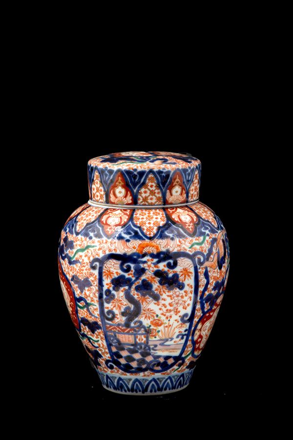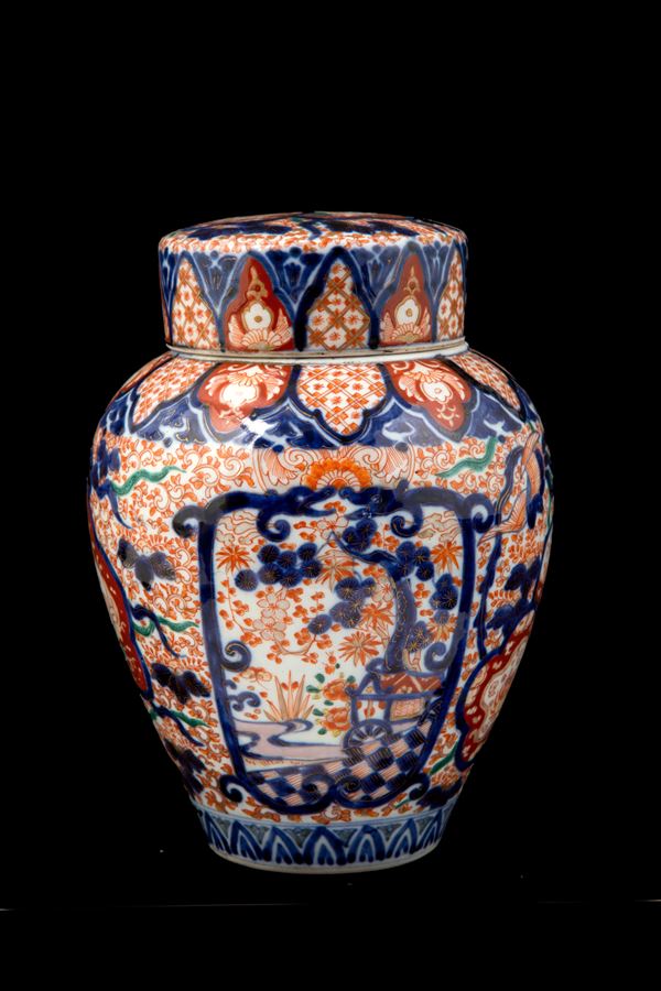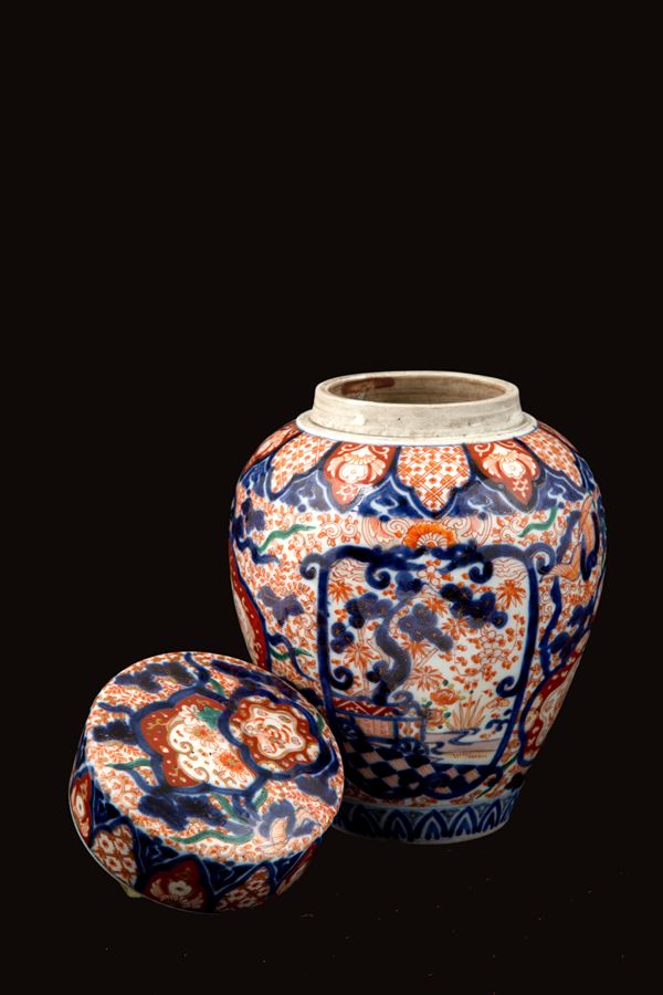 Vaso con coperchio in porcellana Imari dipinta a motivi vegetali. Giappone. Fine XIX secolo.