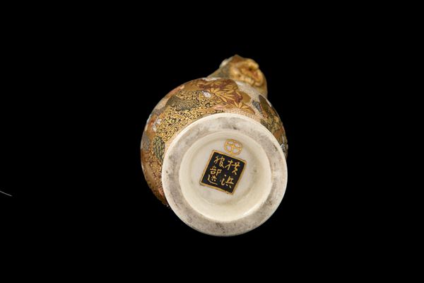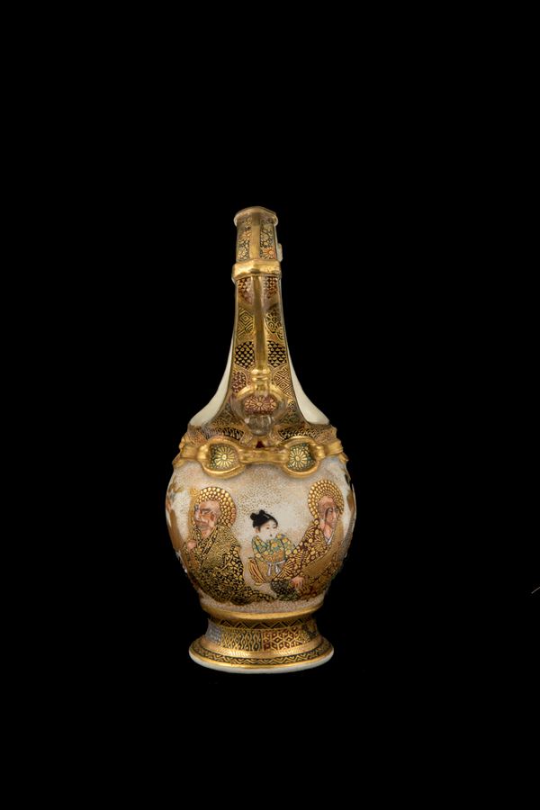 Vaso con manico in porcellana Satsuma dipinta e dorata. Marcato sul fondo. Giappone. Fine XIX secolo.