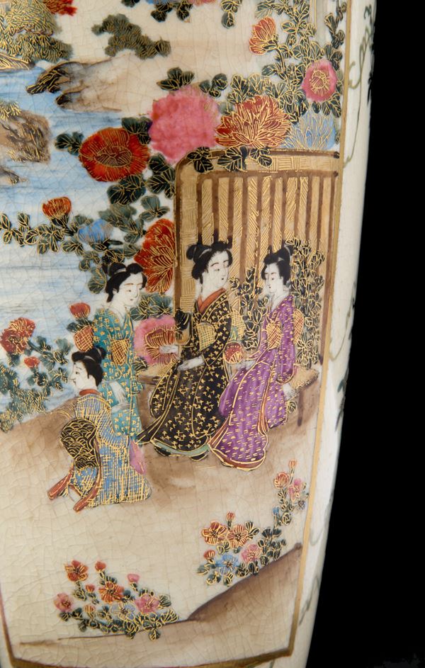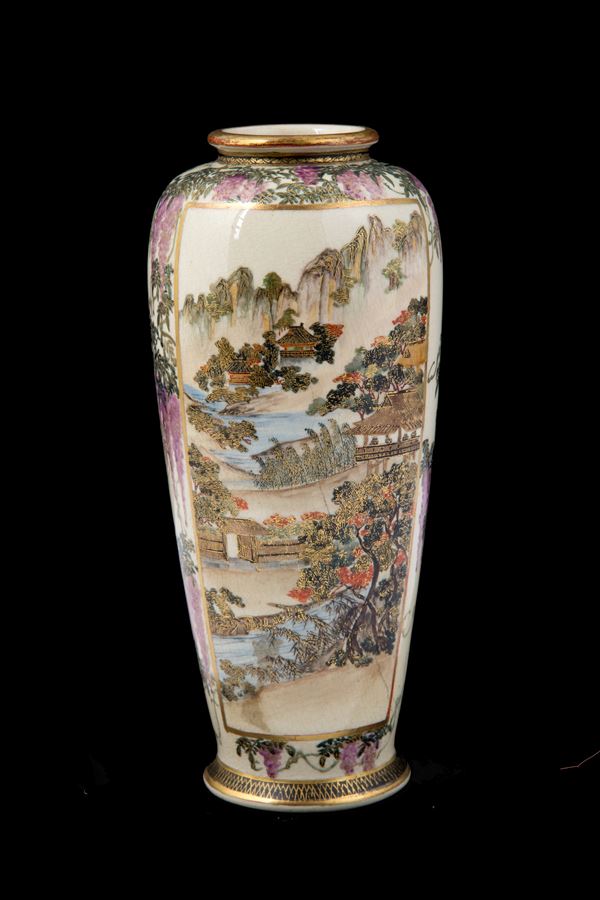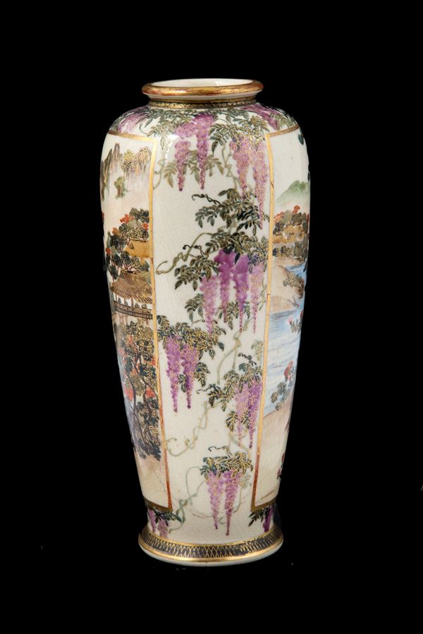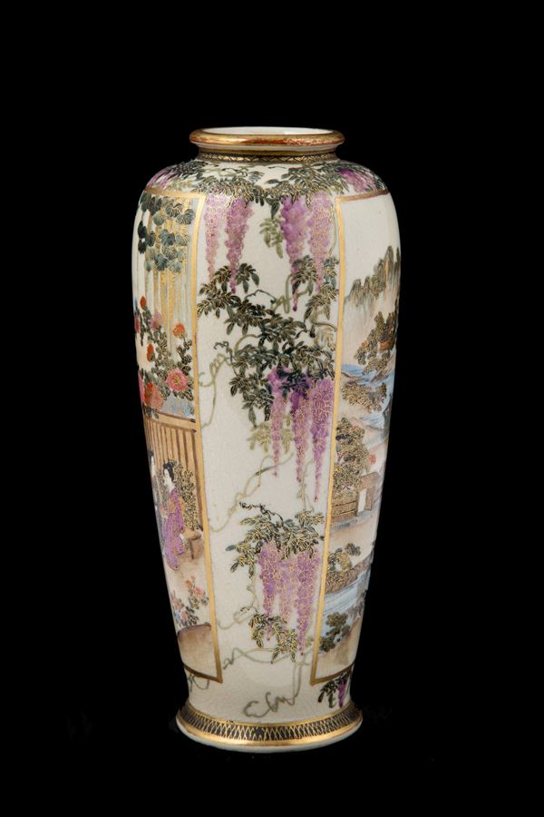 Vaso in porcellana Satsuma dipinta e dorata, decorata con scene di vita e paesaggi. Marcato sul fondo. Giappone. Fine XIX secolo.