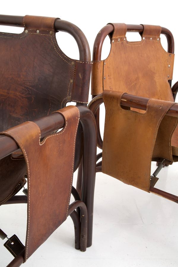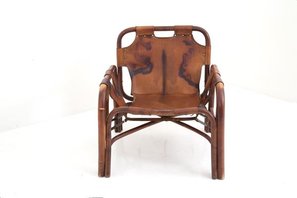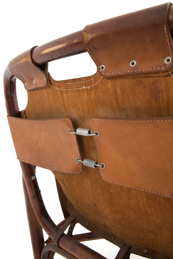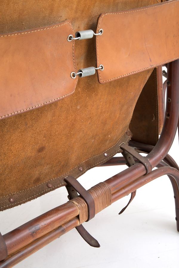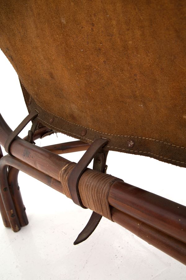 Tre poltrone modello Safari in bambù e pelle. Anni '70. Difetti e usure del tempo.