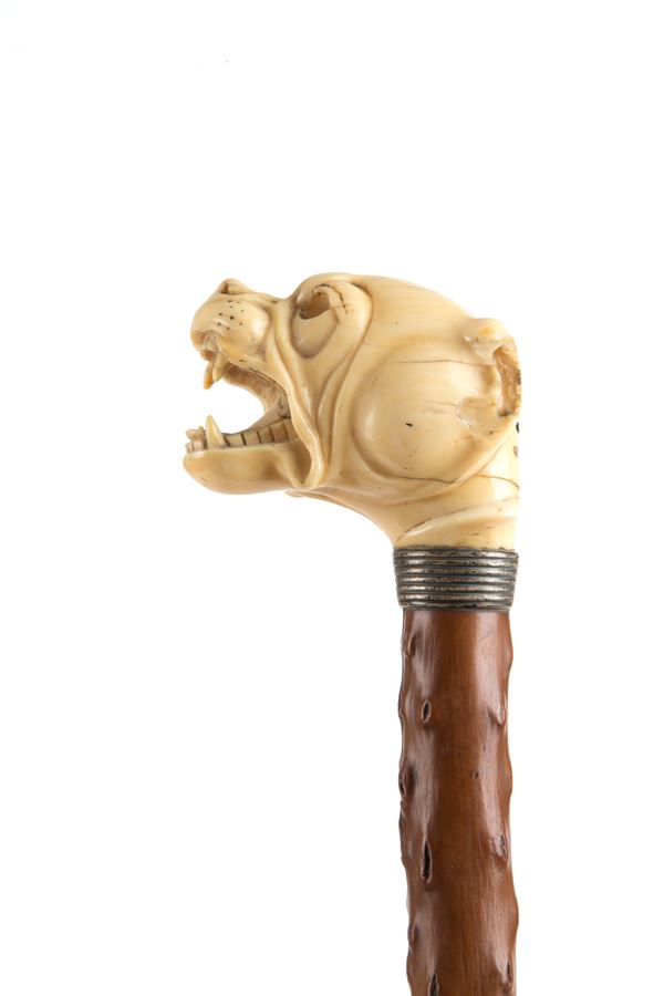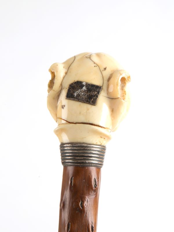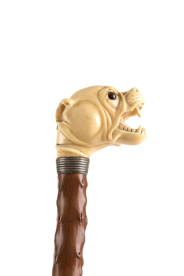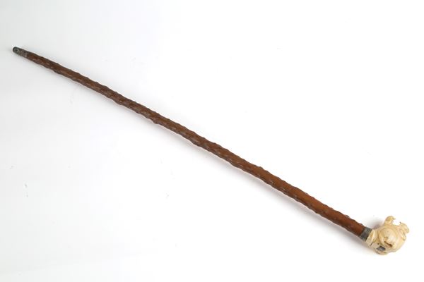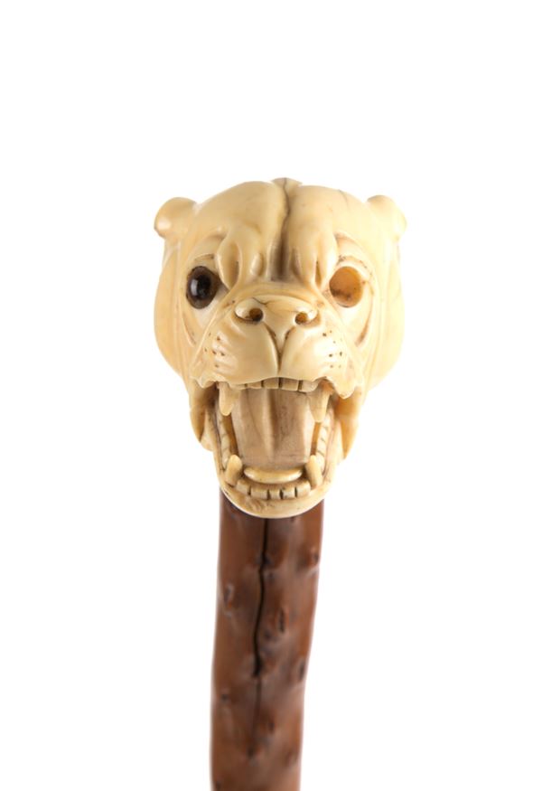 Bastone da passeggio in legno con pomello in avorio raffigurante "TESTA DI BULLDOG". Con targhetta di provenienza. Francia. Lievi difetti e mancante di un occhio in vetro. Con certificato CITES.