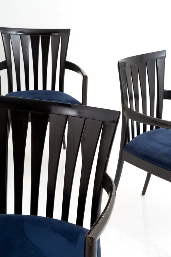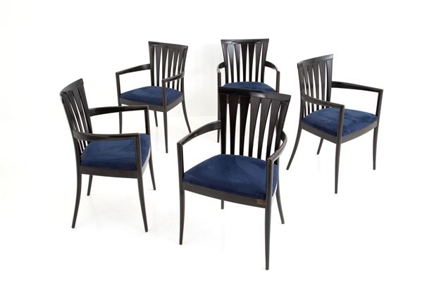 Cinque sedie in legno tinto e laccato nero. Difetti ed usure del tempo.