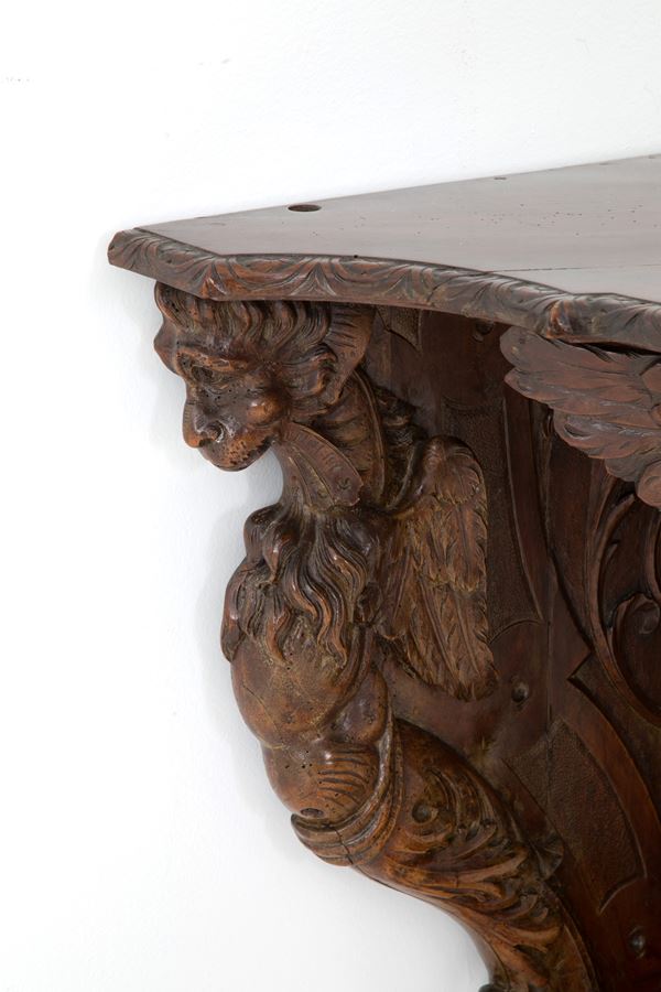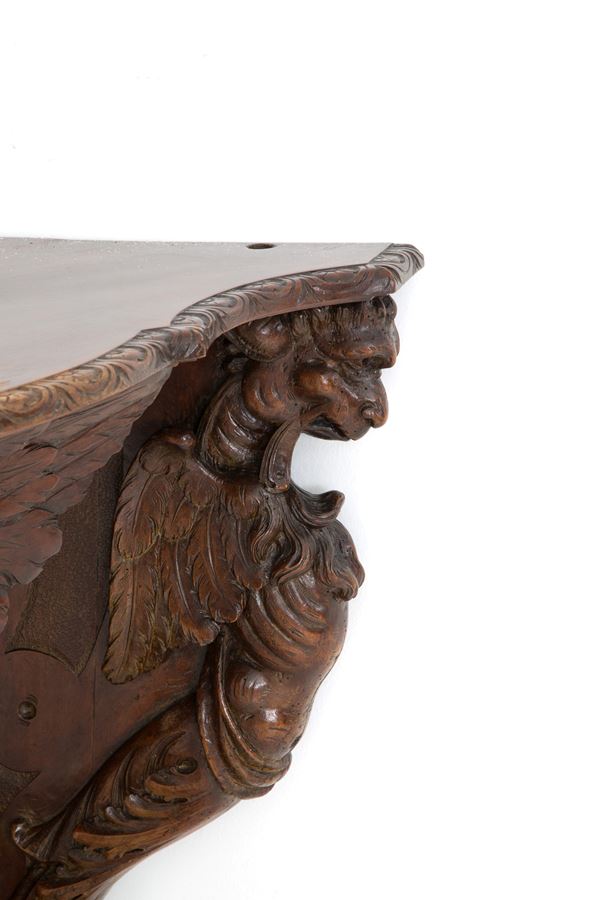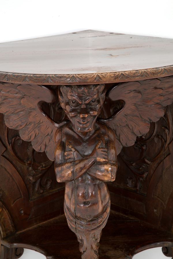 Consolle angolare in noce intagliato con gambe a guisa di animali fantastici. Italia meridionale. XIX secolo. Lievi difetti.