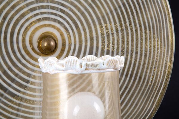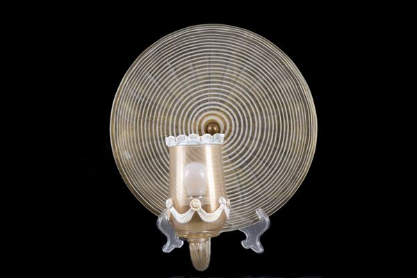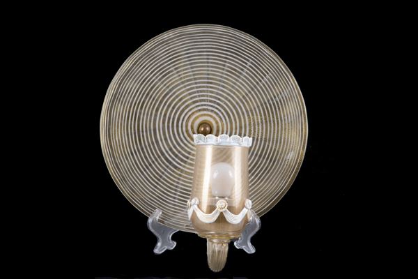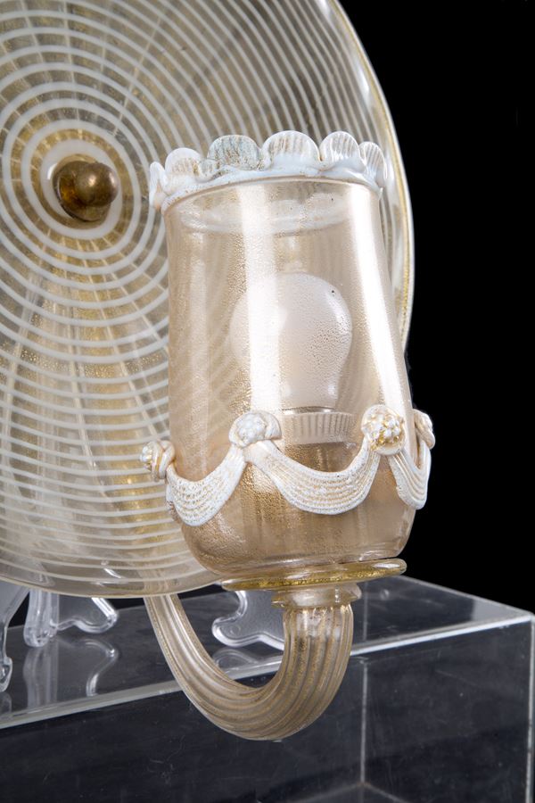 Coppia di applique tonde in vetro soffiato lumeggiato in oro con decori bianchi. Murano. Inizi XX secolo. Piccolo difetto ad una.