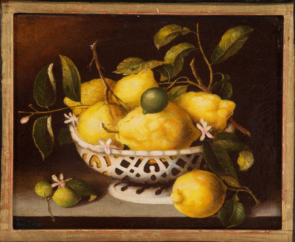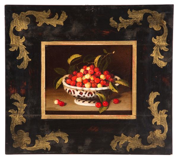 Coppia di dipinti olio su tela raffiguranti "NATURE MORTE". In cornice laccata e dorata. Fine XIX secolo.