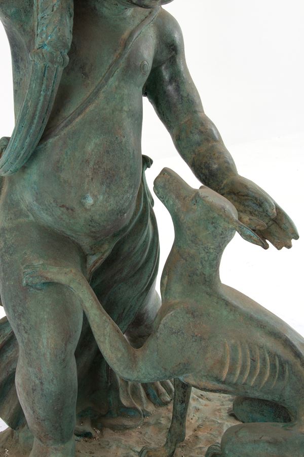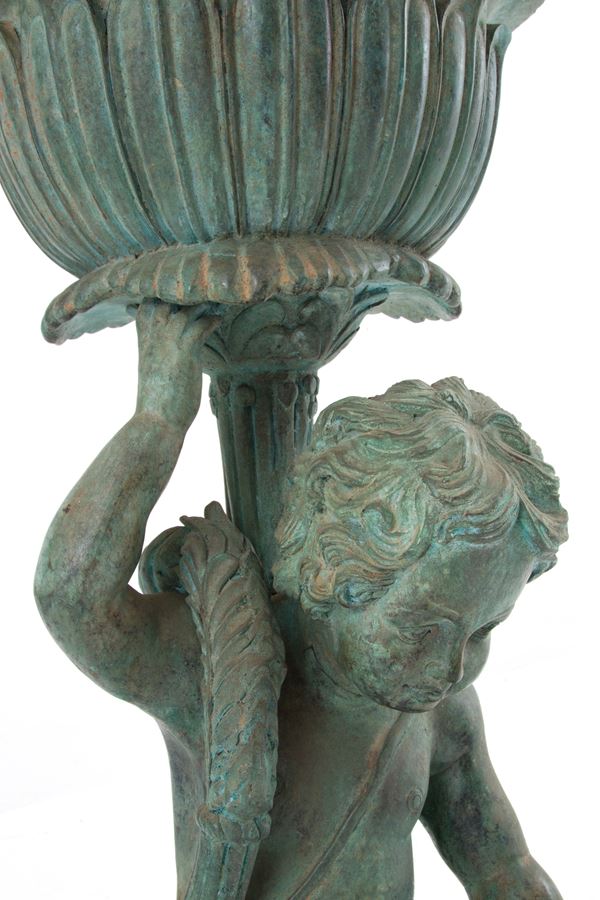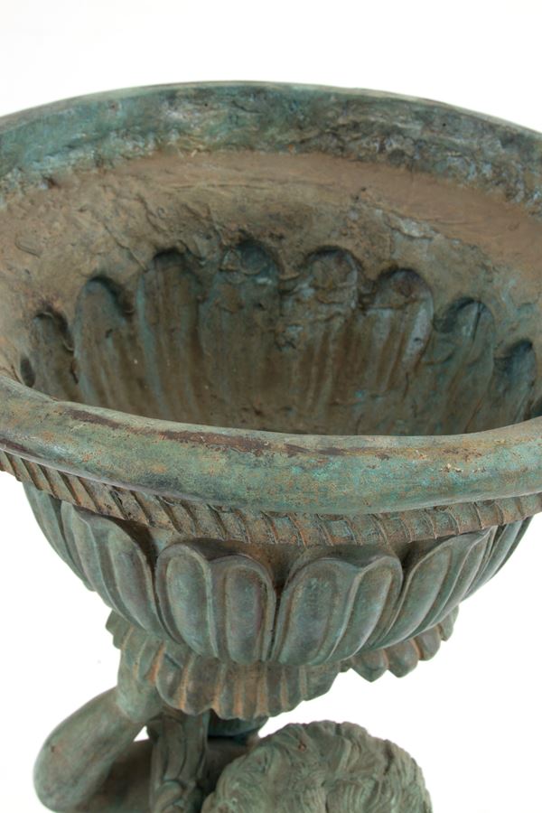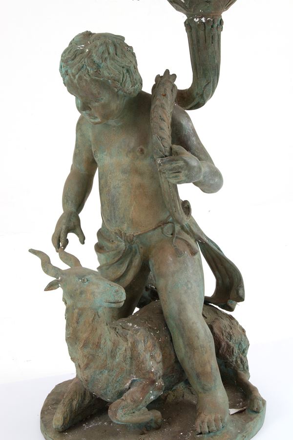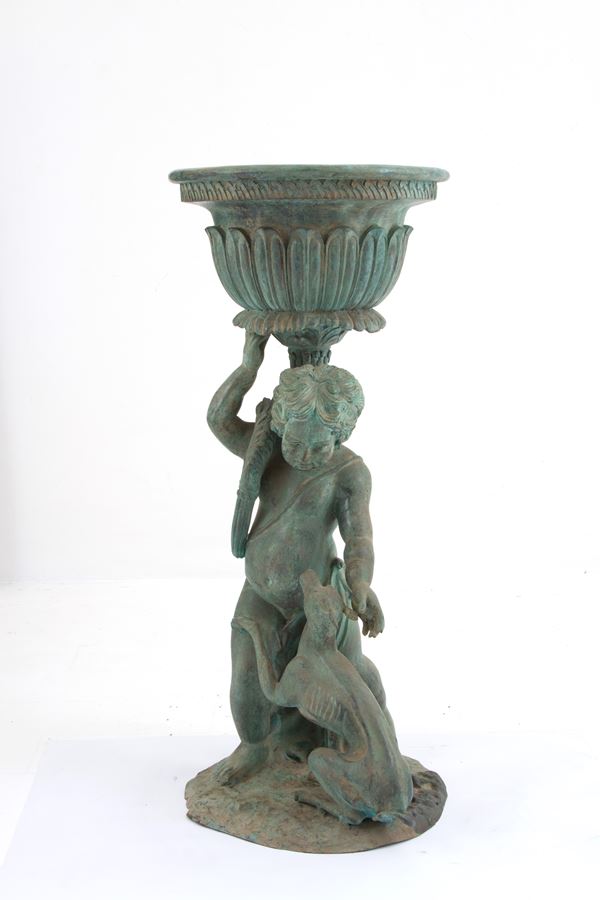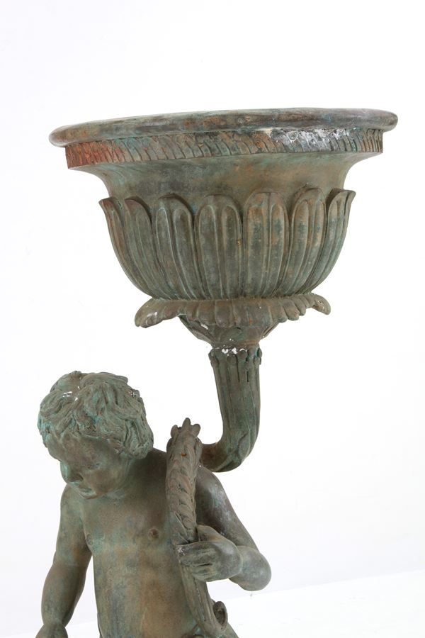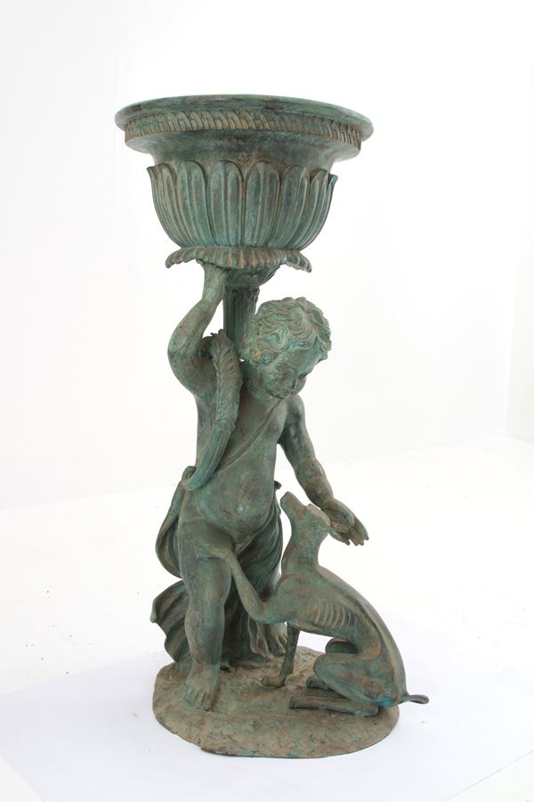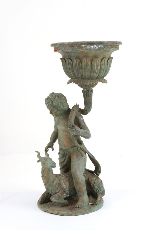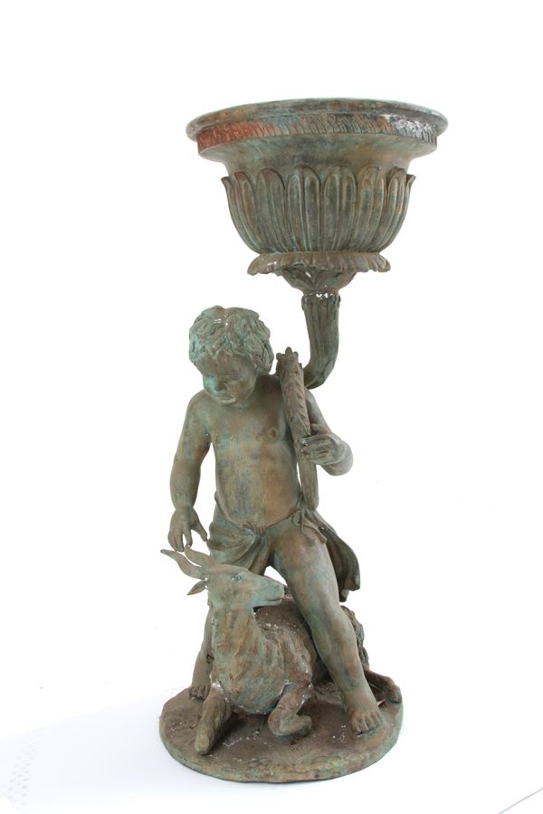 Coppia di fioriere in ghisa con putti rispettivamente con capra e cane alla base. Fine XIX-inizi XX secolo. Difetti.