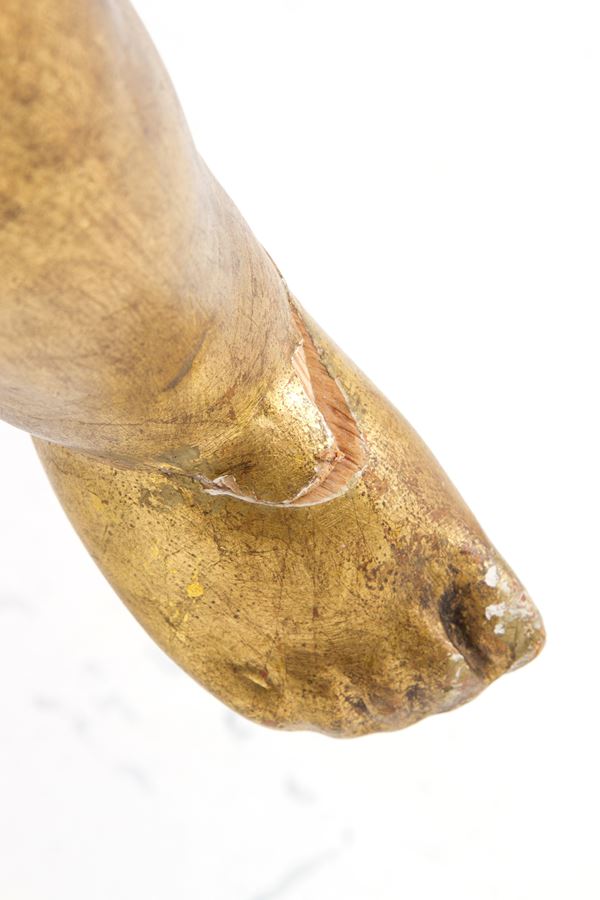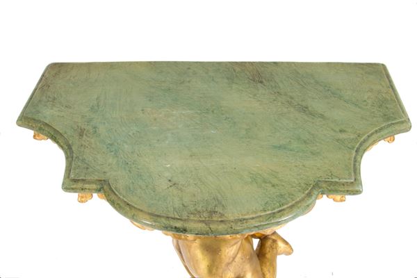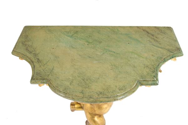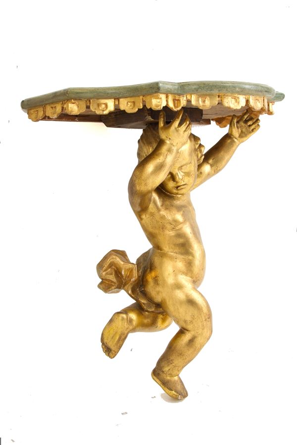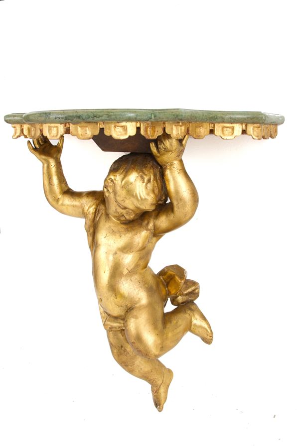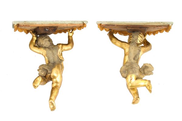 Coppia di mensole sorrette da putti in legno intagliato e dorato. Inizi XX secolo. Difetti.