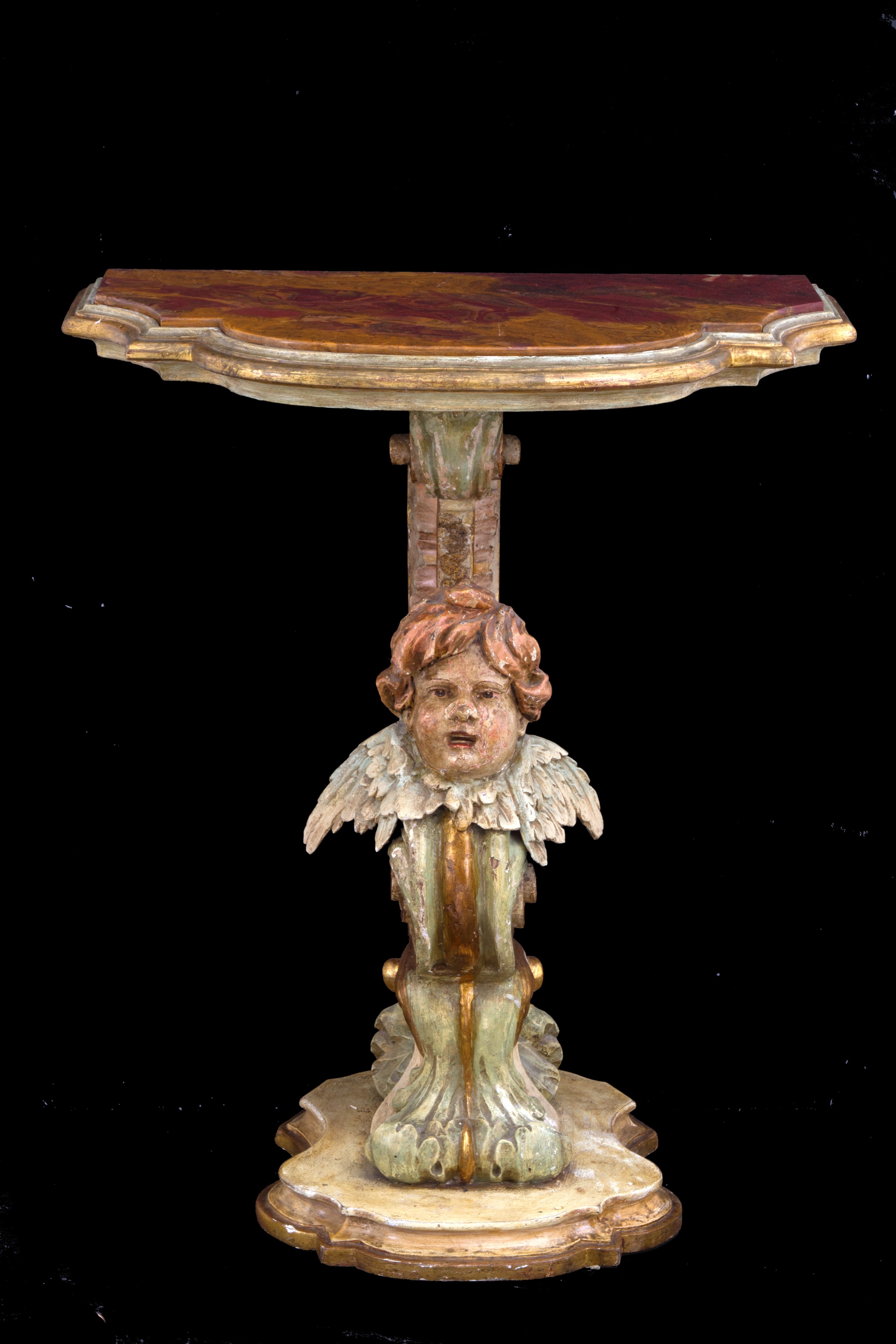 Coppia di piccole consolle in legno intagliato, laccato e dorato con cherubini. Piano in marmo. XIX secolo. Difetti.