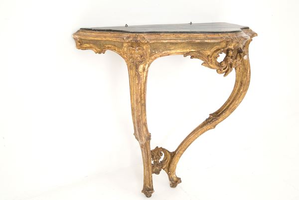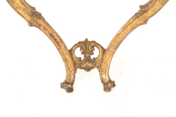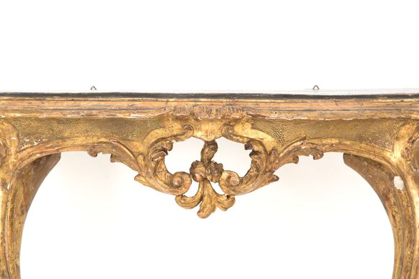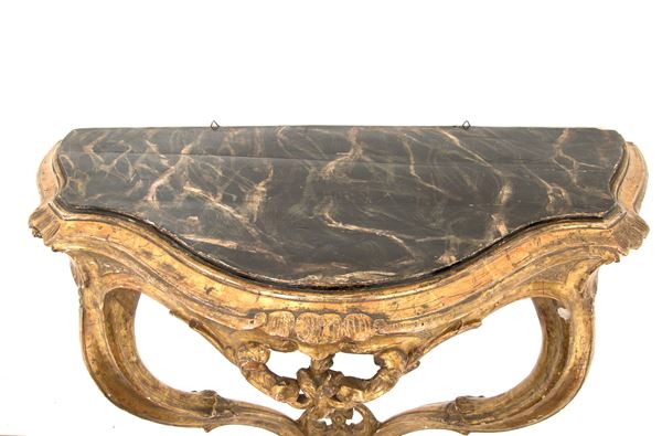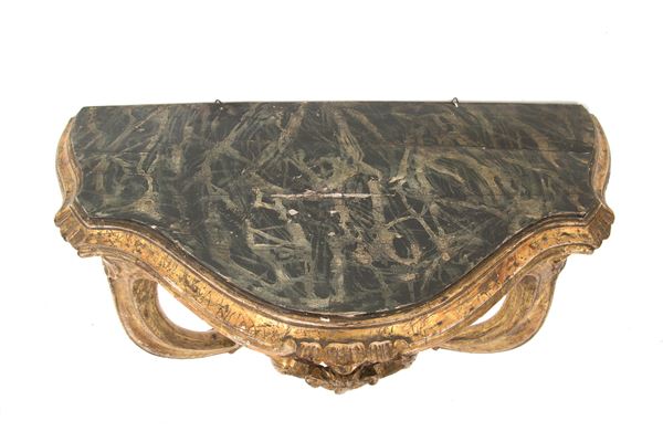 Coppia di piccole consolle da muro in legno intagliato e dorato a mecca con gambe a goccia e piano sagomato a finto marmo. Italia meridionale. XVIII secolo. Lievi difetti.