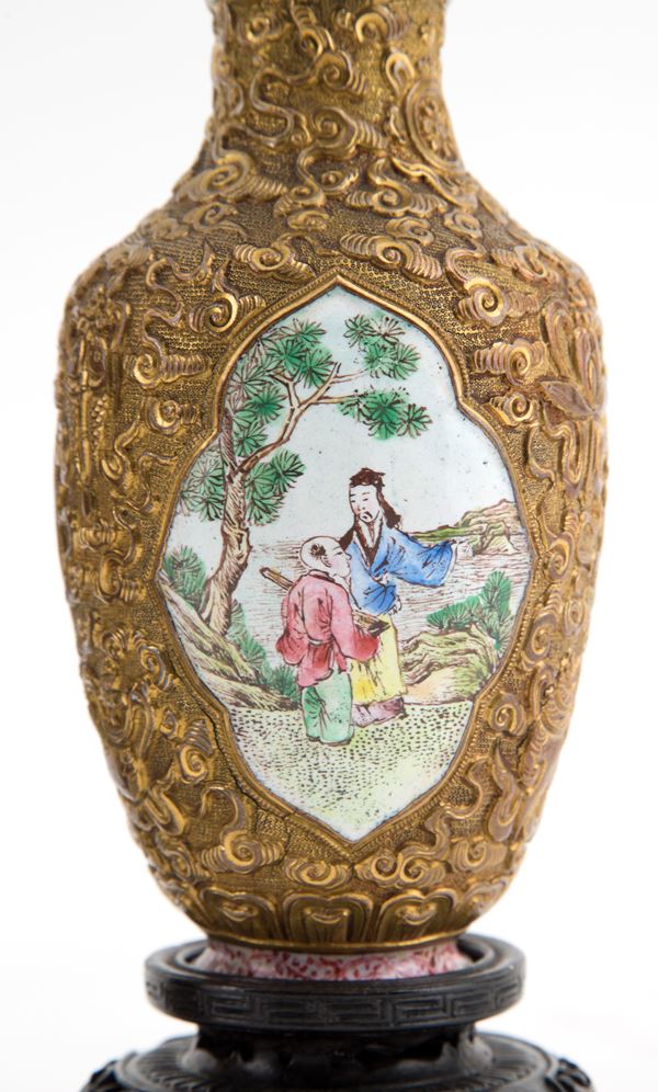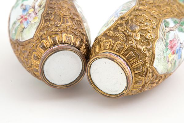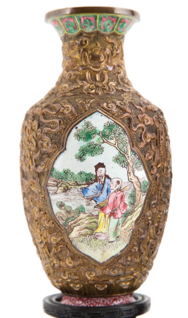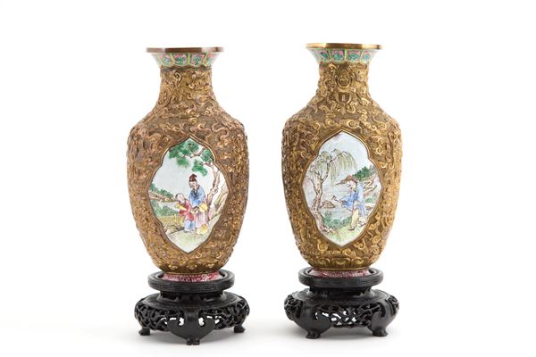 Coppia di piccoli vasi in metallo sbalzato e smaltato raffiguranti scene di vita. Basi in legno. Cina.