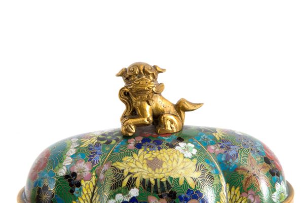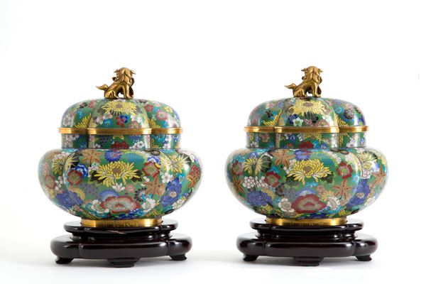 Coppia di vasi cloisonné con coperchio decorati con fiori e con cane di Fo sulla sommità. Con scritta sul bordo in inferiore. Basi in legno. Cina.