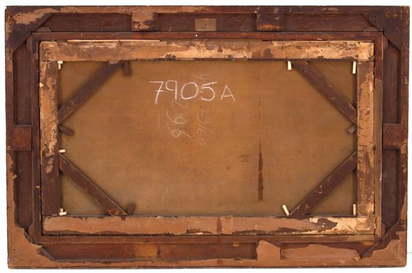 Dipinto olio su tela raffigurante "COSTIERA NAPOLETANA CON PERSONAGGI E ANIMALI". XIX secolo. In cornice in legno intagliato e dorato. Lievi restauri.
