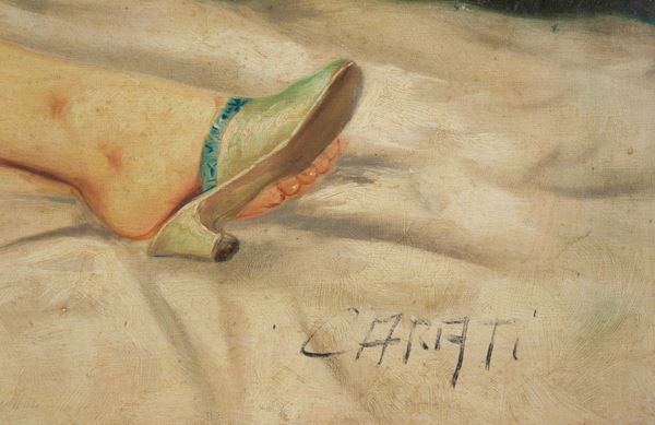 Dipinto olio su tela raffigurante "DONNA NUDA DISTESA". Firmato CARATI in basso a destra. In cornice. Difetti.