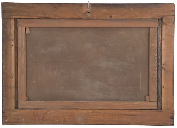 Dipinto olio su tela raffigurante "PAESAGGIO CON CANESTRA DI FRUTTA". XIX secolo. In cornice.