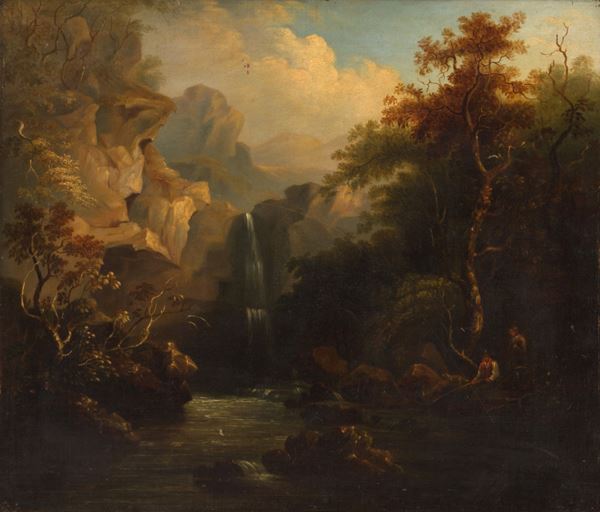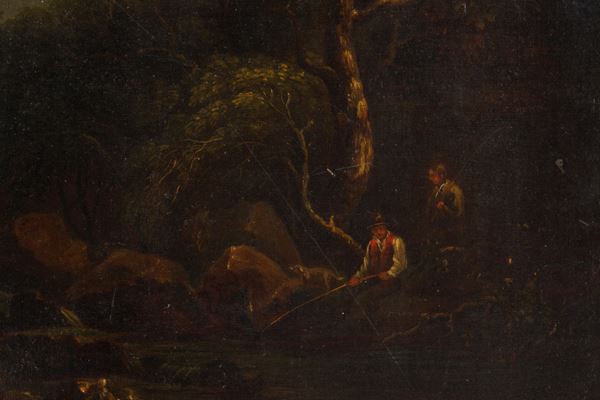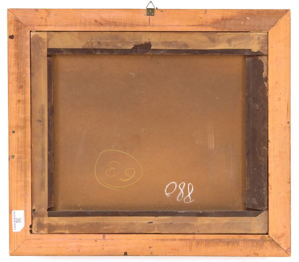 Dipinto olio su tela applicata su cartone raffigurante "PAESAGGIO CON FIGURE". XIX secolo. In cornice. Difetti.