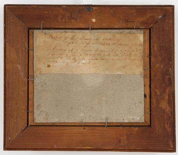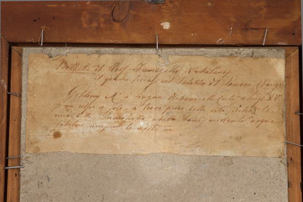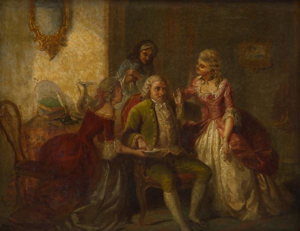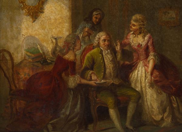 Dipinto olio su cartoncino raffigurante "SALOTTO". XVIII secolo. In cornice. Lievi difetti e restauri.