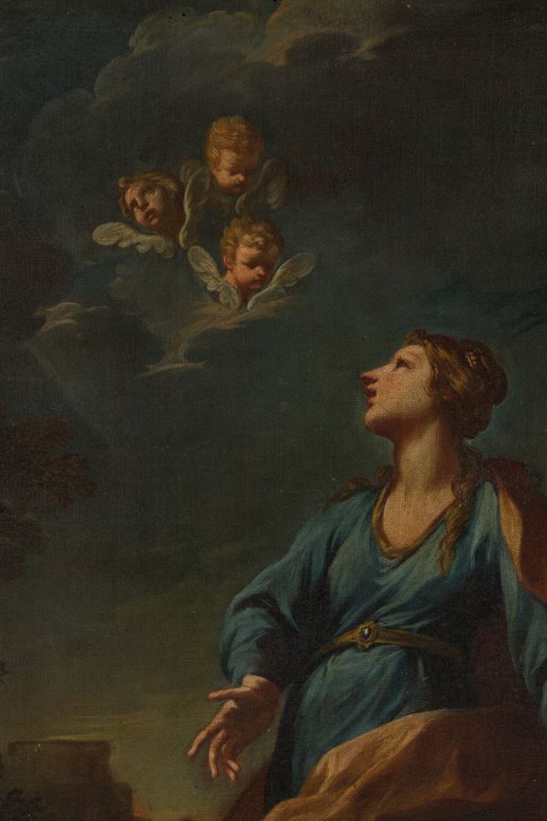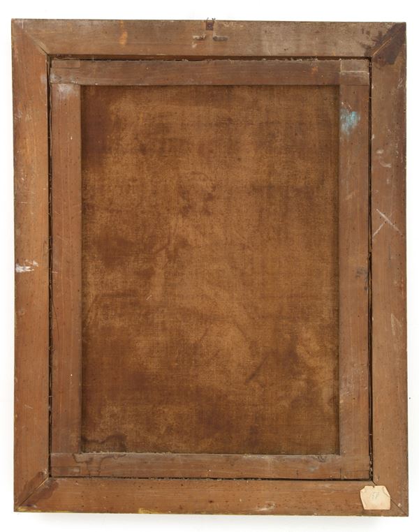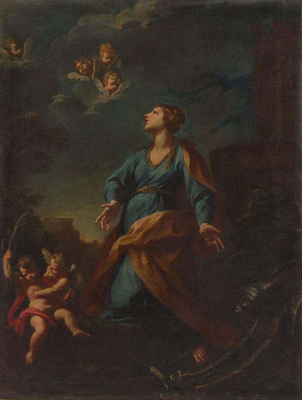Dipinto olio su tela raffigurante "SANTA BARBARA". XVIII secolo. In cornice dorata. Difetti e restauri.
