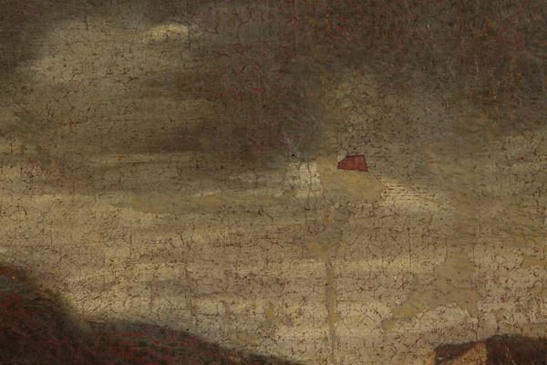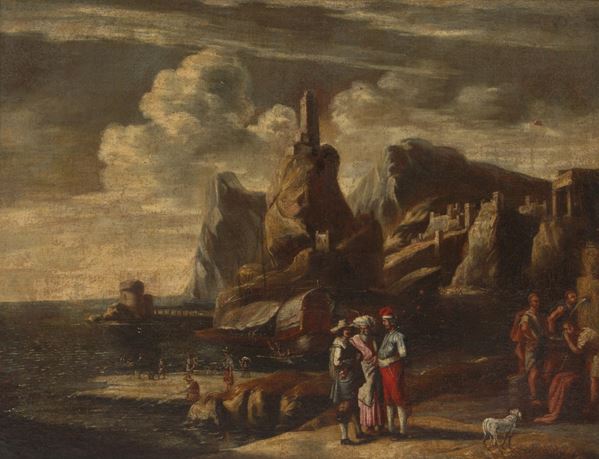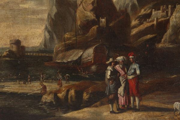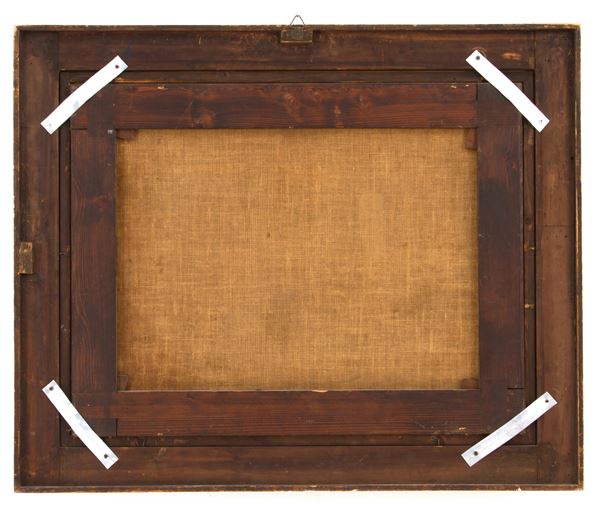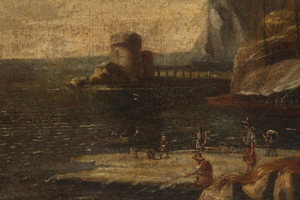 Dipinto olio su tela raffigurante ''SCENA PORTUALE''. XVIII secolo. In cornice laccata e dorata. Difetti.
