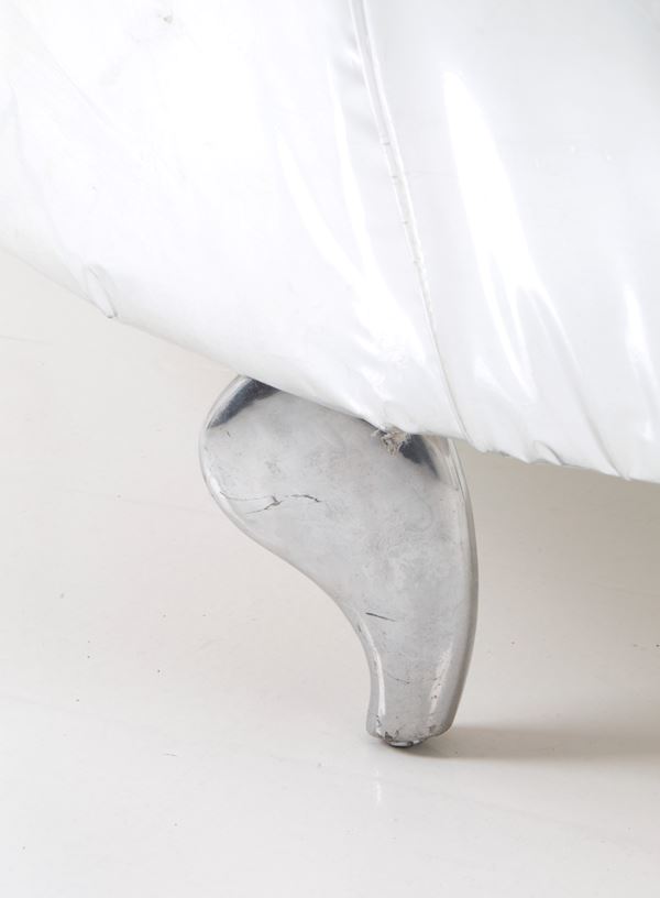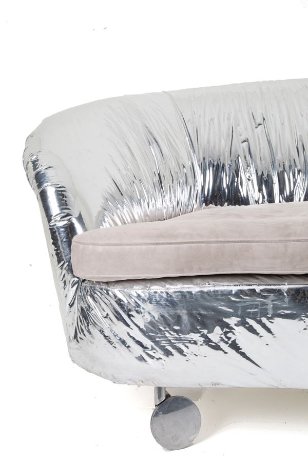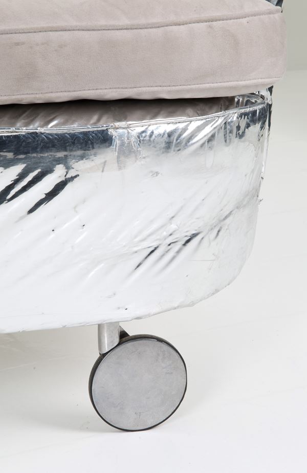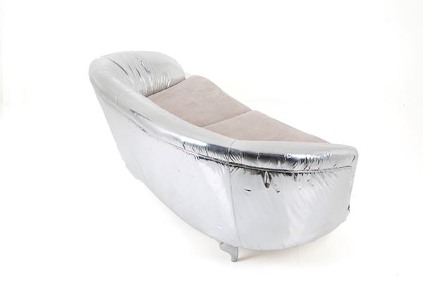 Divano a fagiolo imbottito e rivestito in tessuto in argento con sedute in alcantara grigio. Francia. Anni '30. Difetti.