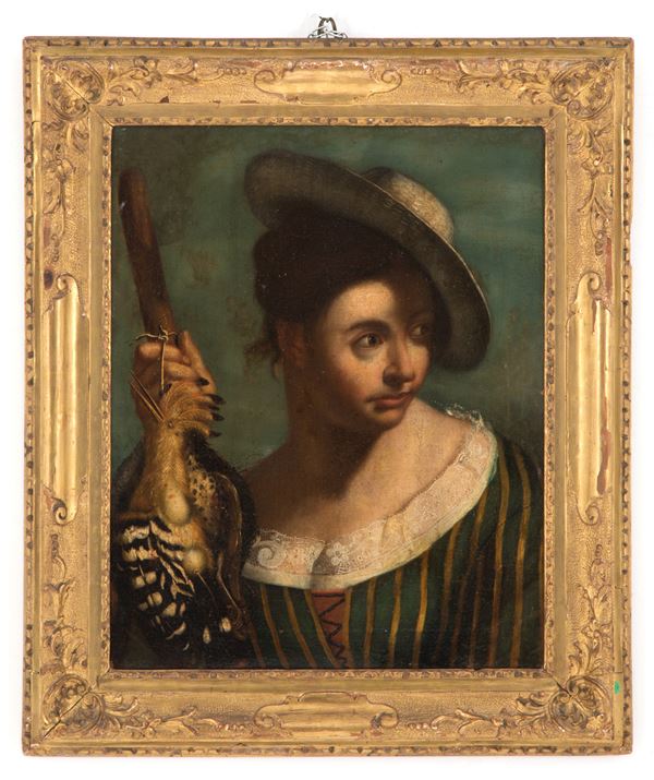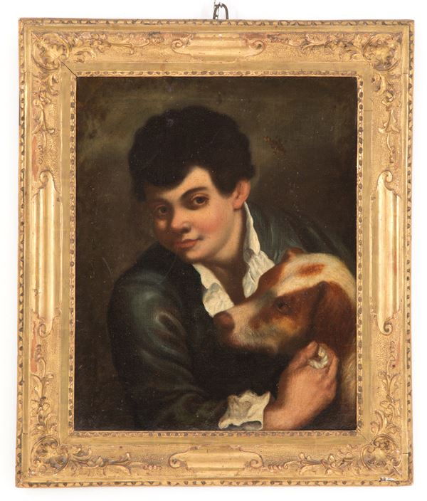 Due dipinti olio su tela raffiguranti "RAGAZZO CON CANE" e "RAGAZZA CON UPUPA". Area veneta. XVIII secolo. In cornici intagliate e dorate. Già rintelati e rintelaiati.