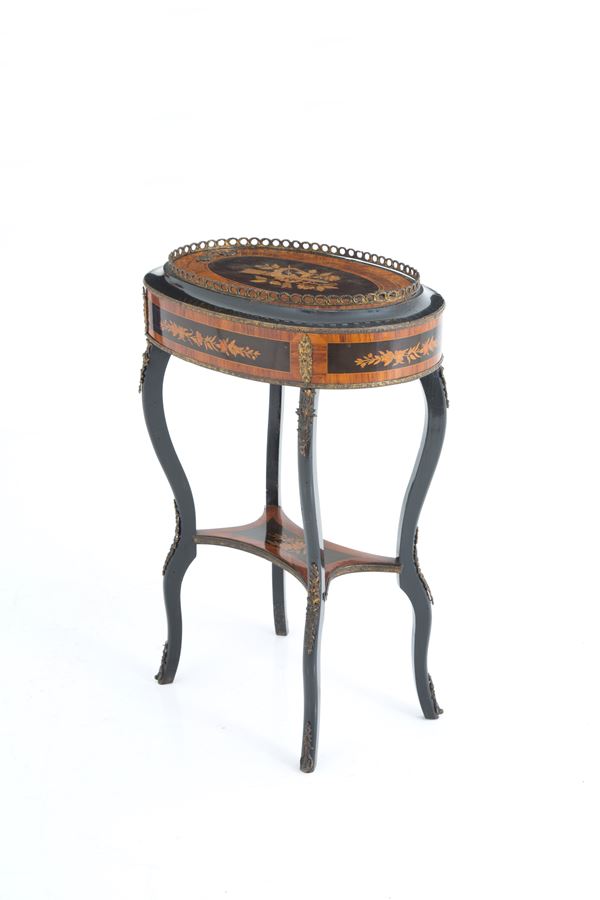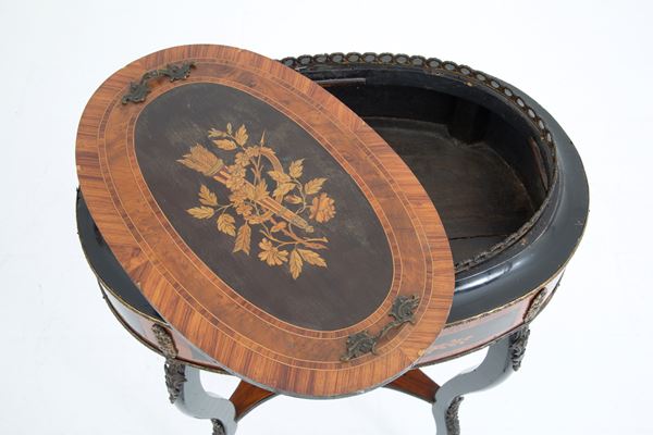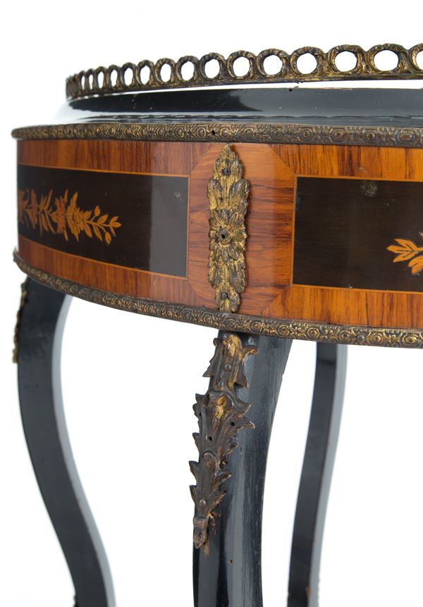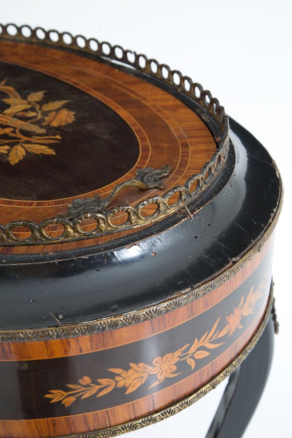 Fioriera di forma ovale lastronata e intarsiata in legni vari con finiture in legno ebanizzato e bronzi cesellati e dorati. Francia. Fine XIX secolo. Difetti.