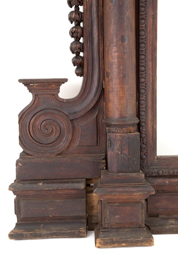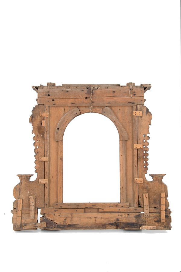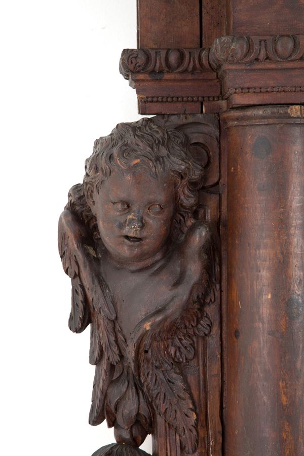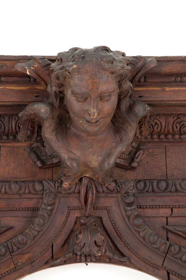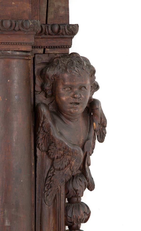 Grande cornice in legno massiccio scolpito con angioletti laterali e cimasa con volto femminile. XVI secolo. Difetti e mancanze.