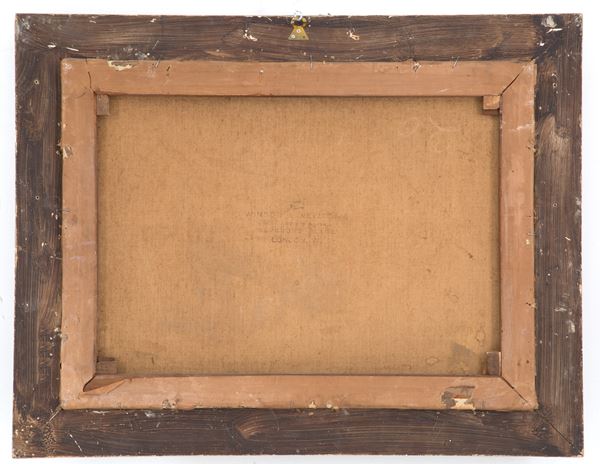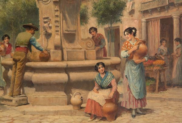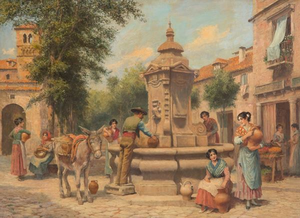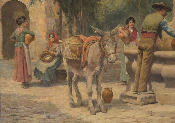 Dipinto olio su tela raffigurante "PIAZZETTA CON FONTANA E PERSONAGGI" Firmato in basso a sinistra. In cornice. Lievi difetti.