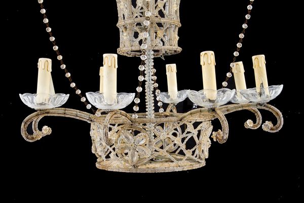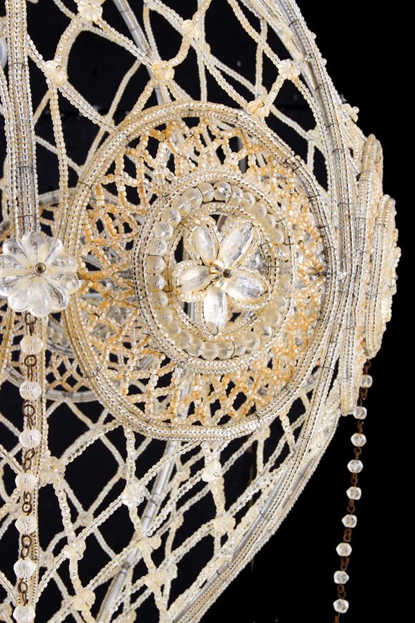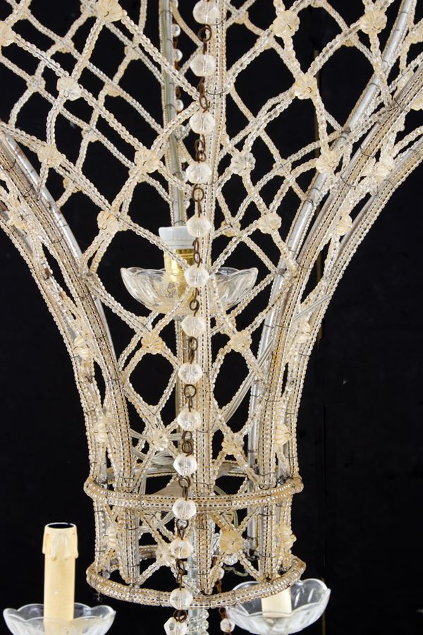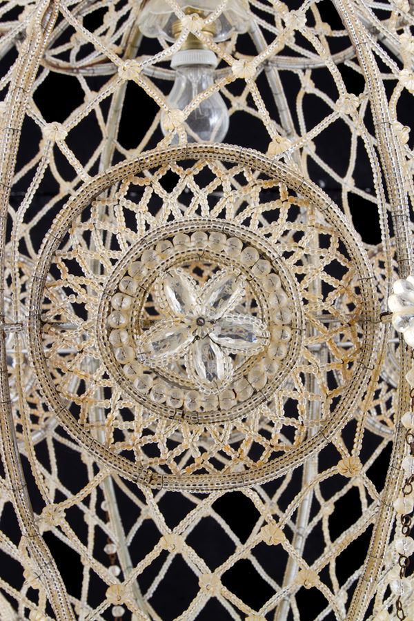 Lampadario a mongolfiera a otto bracci in perline di vetro. XX secolo. Difetti.