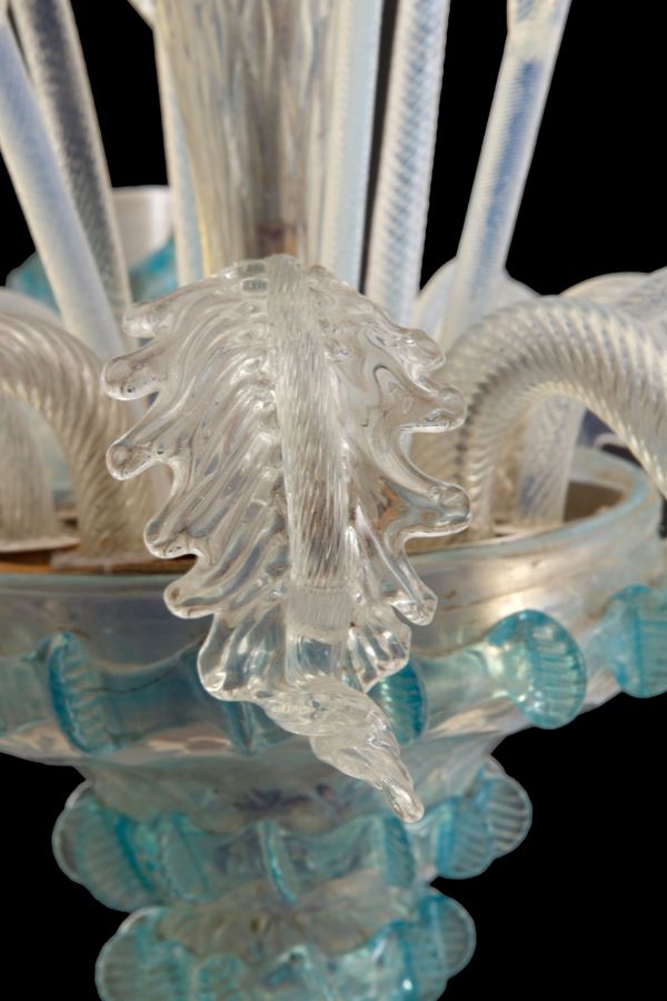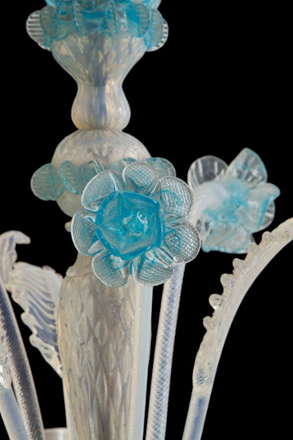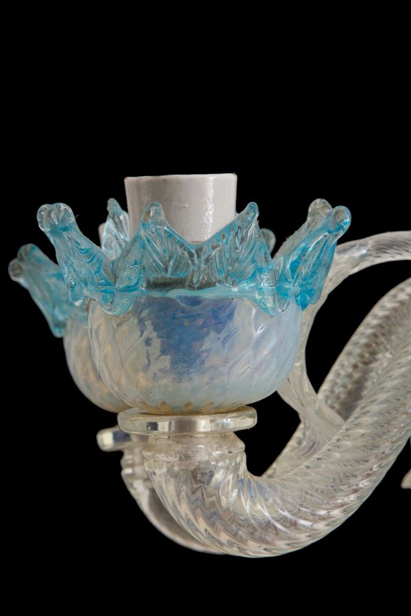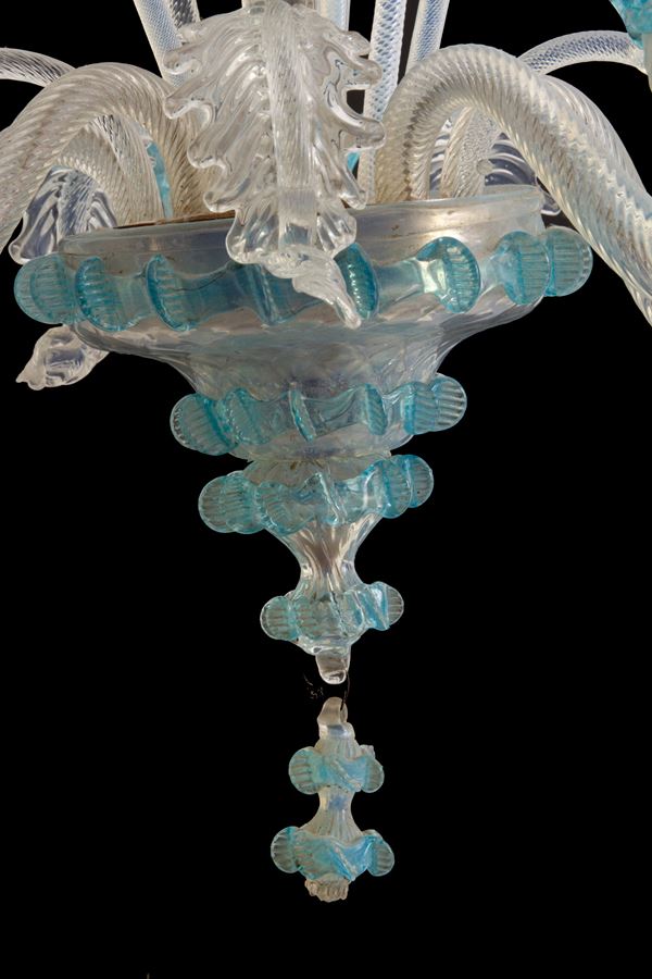 Lampadario cinque luci in vetro di Murano con finiture azzurre. Inizi XX secolo. Piccoli difetti.