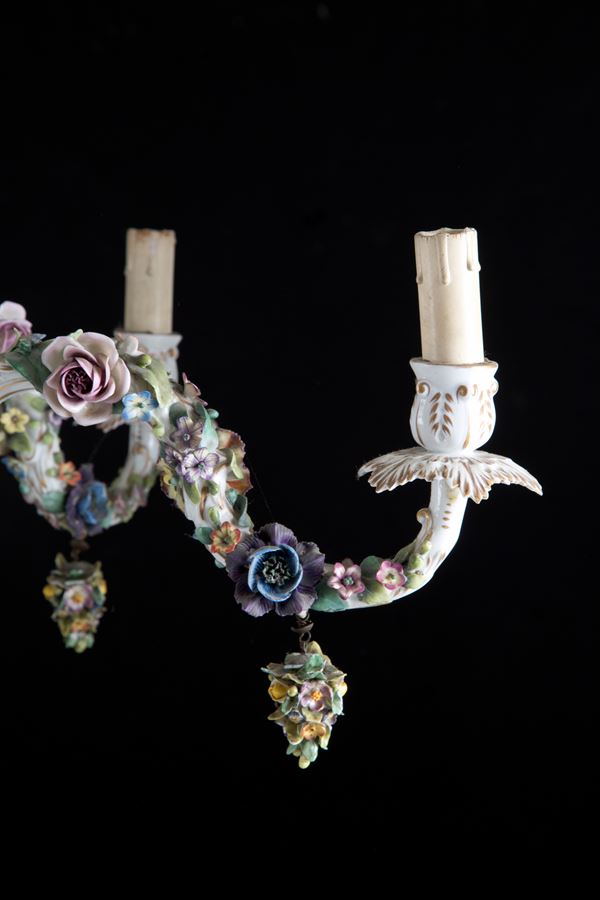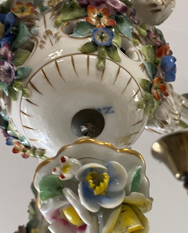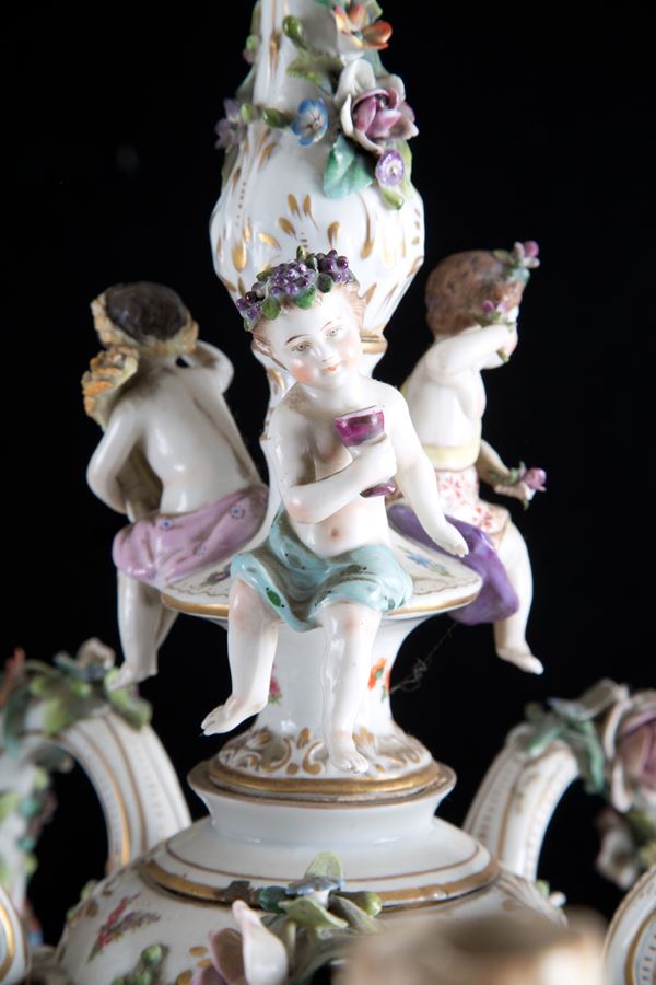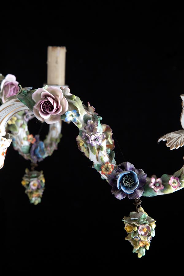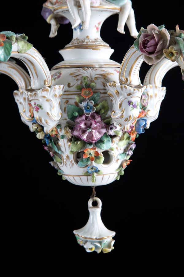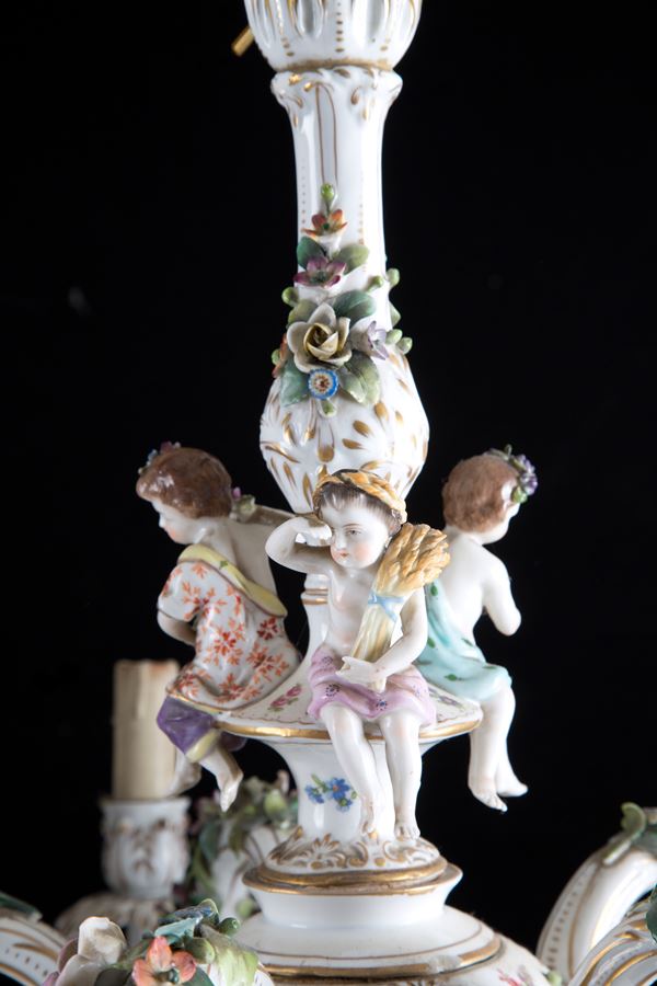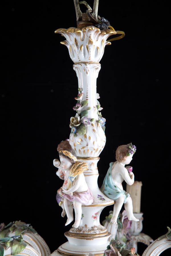 Lampadario cinque luci in porcellana dipinta e decorata con fiori e tre fanciulli. Marcato CAPODIMONTE sotto il fusto. Fine XIX secolo. Lievi difetti e mancanze.