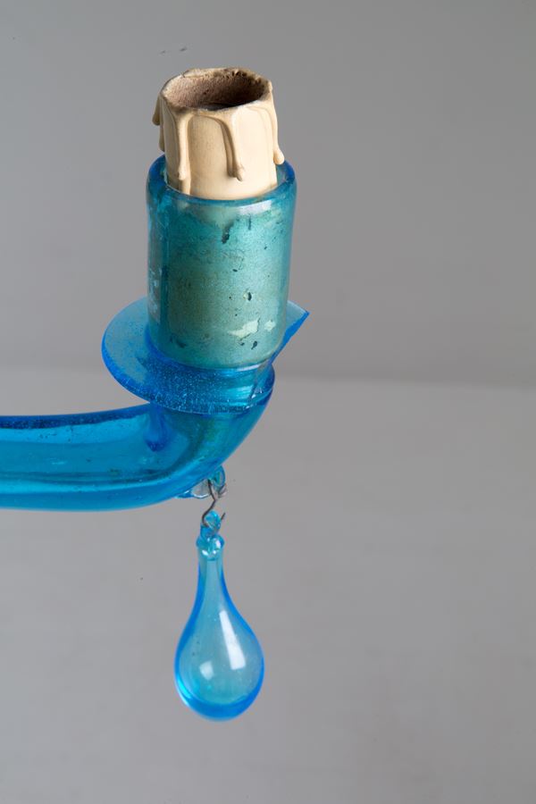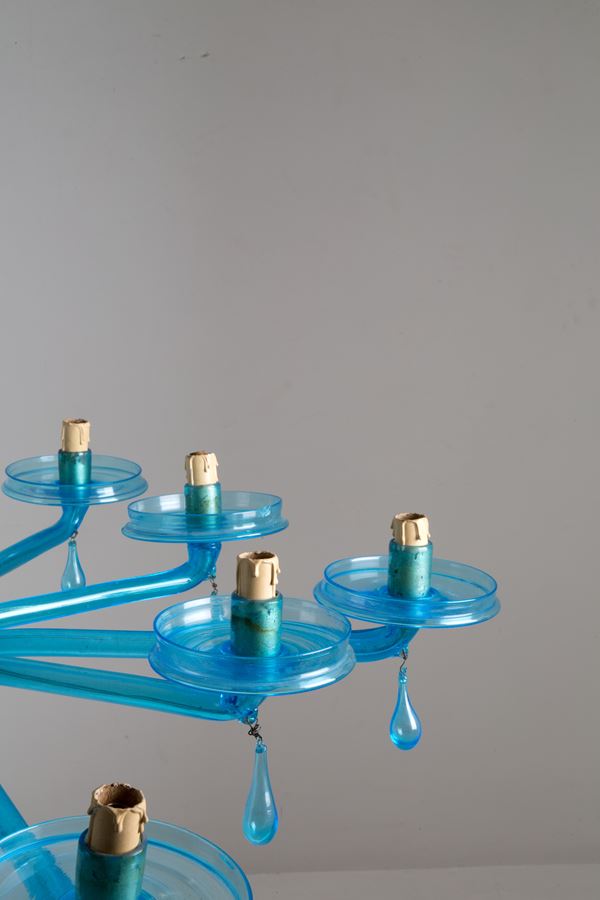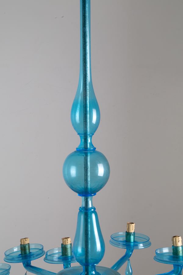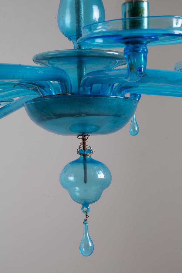 Lampadario dodici braccia in vetro soffiato di Murano color azzurro con pendenti a goccia. Produzione VENINI.