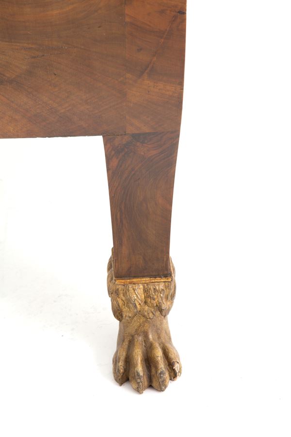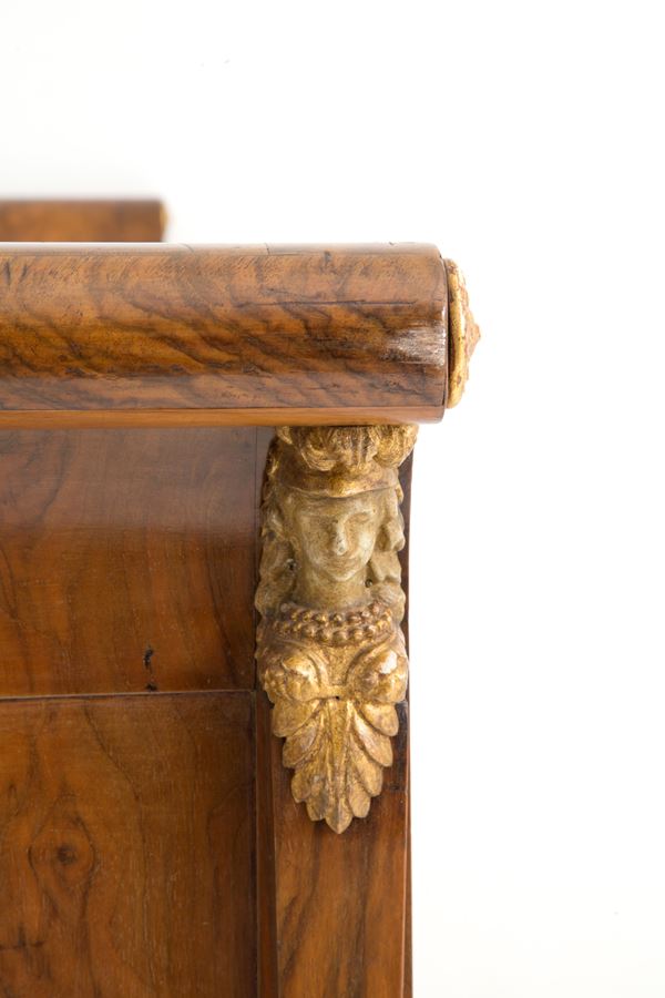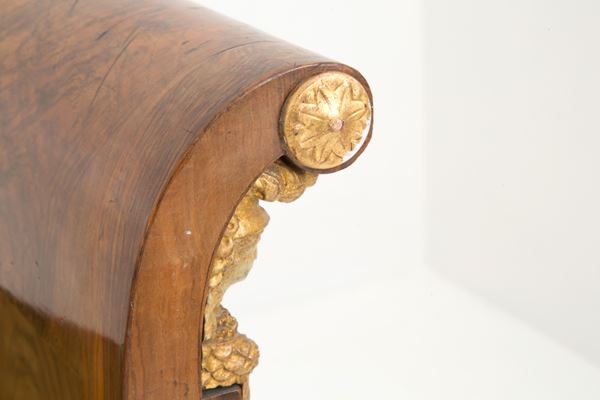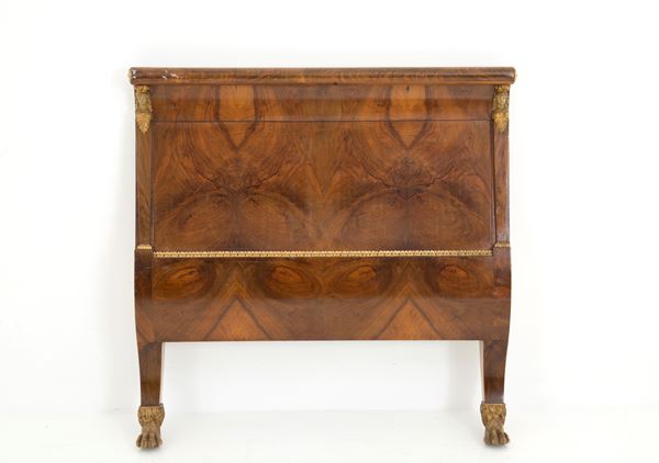 Letto a barca ad una piazza lastronato in radica di noce con fregi e piedini ferini in legno intagliato e dorato. Periodo Impero. Lievi difetti.