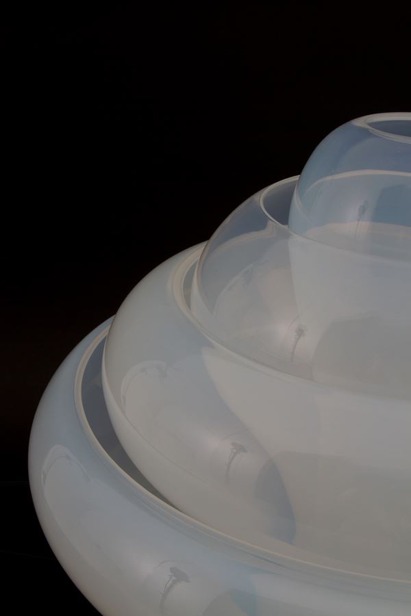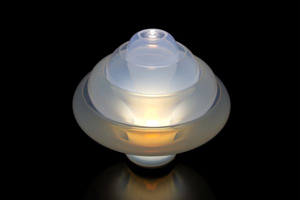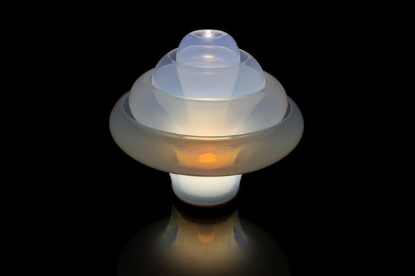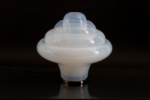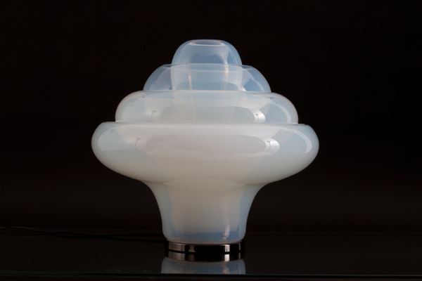 Lampada da tavolo modello Lotus LT 305 in vetro di Murano opalino e base in metallo. Produzione MAZZEGA. Anni '60.