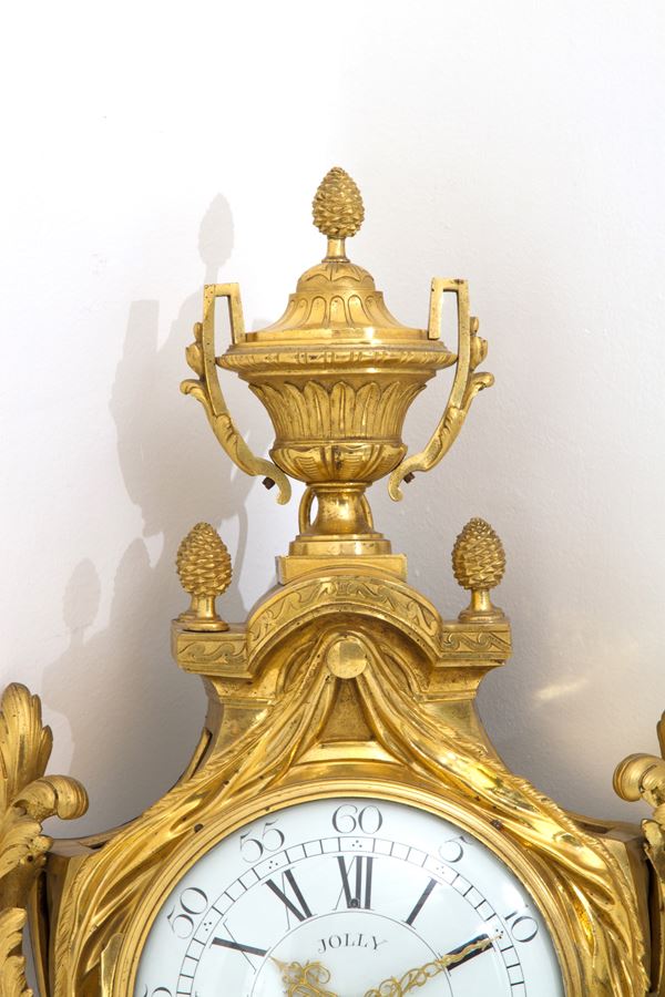 Orologio Cartel da muro in bronzo finemente cesellato e dorato. Quadrante smaltato con numeri romani e scritta 'Jolly a Paris'. XIX secolo.