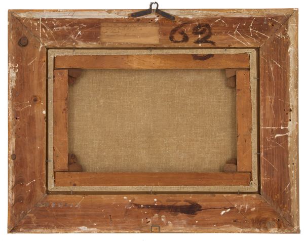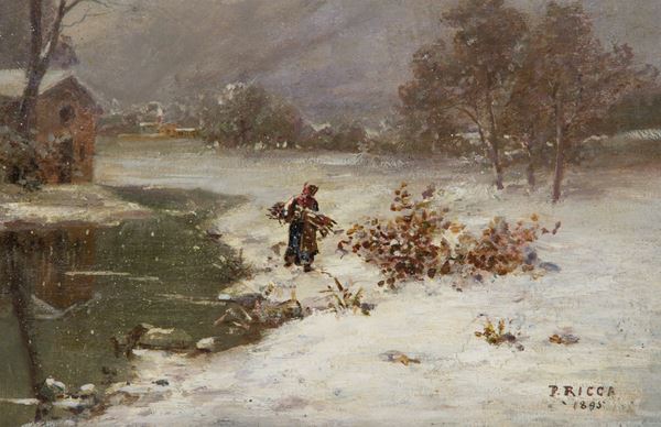 Dipinto olio su tela raffigurante "PAESAGGIO INVERNALE CON PERSONAGGI". Firmato e datato 1895 in basso a destra. In cornice.