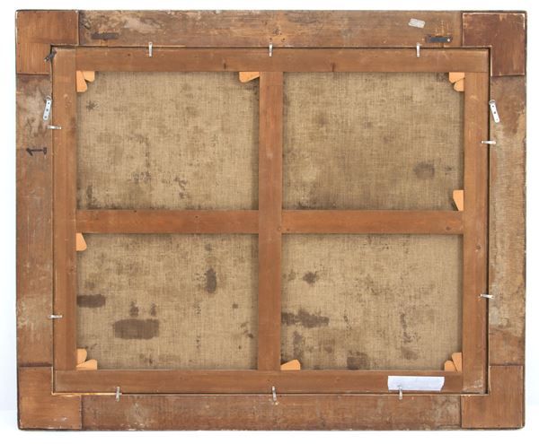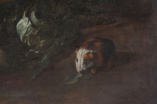 Dipinto olio su tela raffigurante "FRUTTI E VERDURE ALL'APERTO CON UN PORCELLINO D'INDIA". In cornice coeva. Vecchio rintelo e rintelaiatura. Restauri. Con perizia del Dr. Gianluca Bocchi.